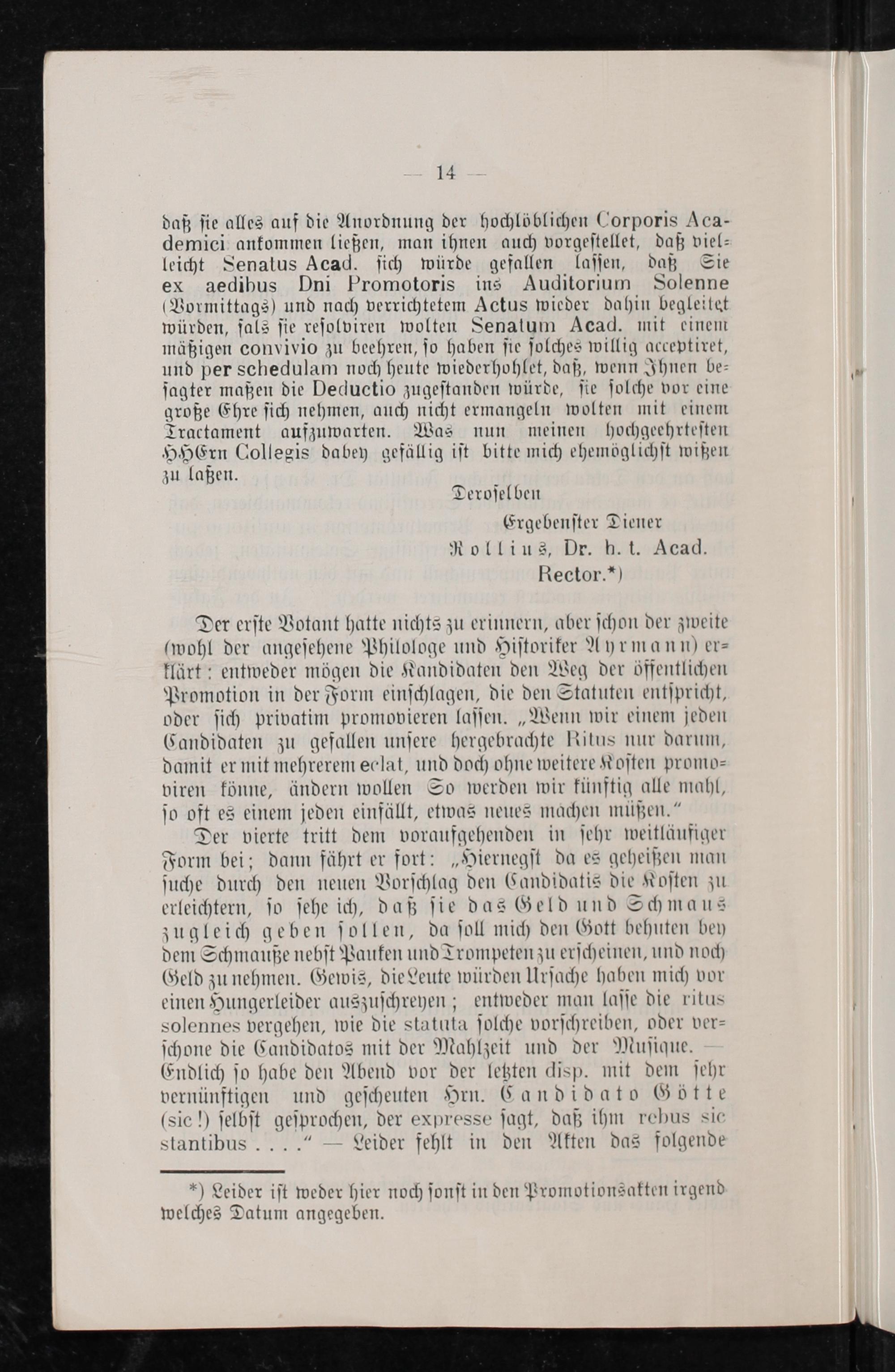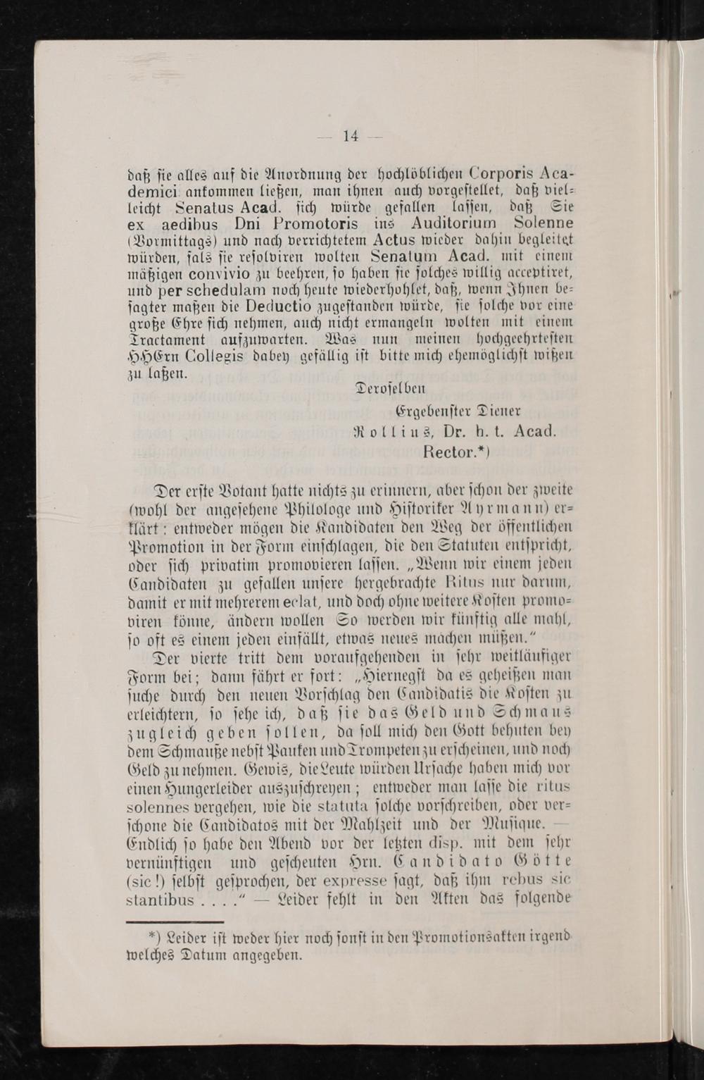 Der vierte tritt dem voraufgehenden in ſehr weitläufiger Form bei; dann fährt er fort:„Hiernegſt da es geheißen man ſuche durch den neuen Vorſchlag den Candidatis die Koſten zu erleichtern, ſo ſehe ich, daß ſie das Geld und Schmaus zugleich geben ſollen, da ſoll mich den Gott behuten bey dem Schmauße nebſt Pauken und Trompetenzu erſcheinen, und noch Geld zu nehmen. Gewis, die Leute würden Urſache haben mich vor einen Hungerleider auszuſchreyen; entweder man laſſe die ritus solennes vergehen, wie die statuta ſolche vorſchreiben, oder ver⸗ ſchone die Candidatos mit der Mahlzeit und der Muſique. Endlich ſo habe den Abend vor der letzten disp. mit dem ſehr vernünftigen und geſcheuten Hrn. Candidato Götte (sic!) ſelbſt geſprochen, der expresse ſagt, daß ihm rebus sic stantibus....“ Leider fehlt in den Akten das folgende