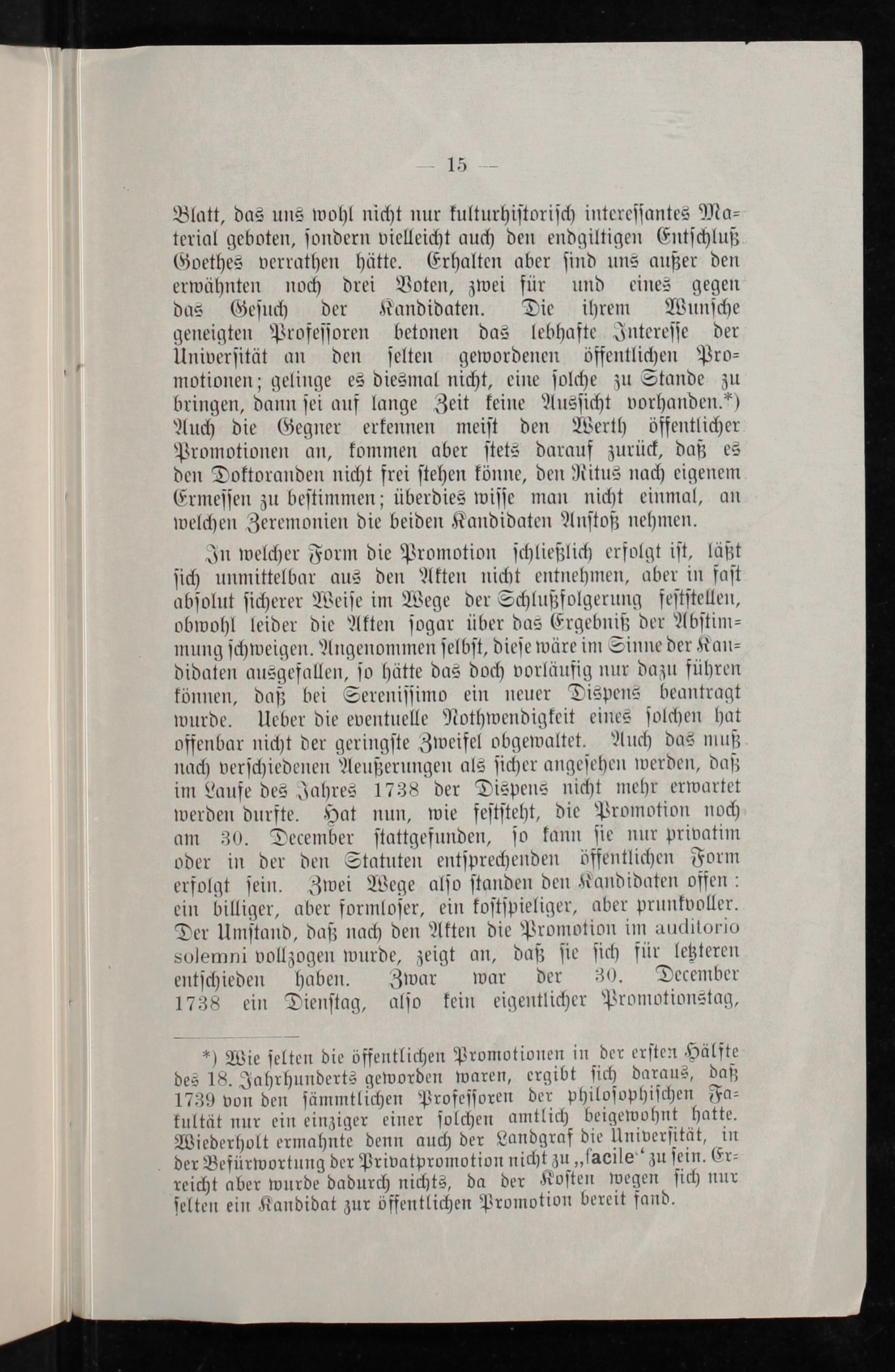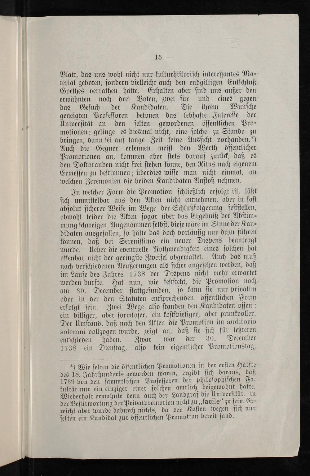 In welcher Form die Promotion ſchließlich erfolgt iſt, läßt ſich unmittelbar aus den Akten nicht entnehmen, aber in faſt abſolut ſicherer Weiſe im Wege der Schlußfolgerung feſtſtellen, obwohl leider die Akten ſogar über das Ergebniß der Abſtim⸗ mung ſchweigen. Angenommen ſelbſt, dieſe wäre im Sinne der Kan⸗ didaten ausgefallen, ſo hätte das doch vorläufig nur dazu führen können, daß bei Sereniſſimo ein neuer Dispens beantragt wurde. Ueber die eventuelle Nothwendigkeit eines ſolchen hat offenbar nicht der geringſte Zweifel obgewaltet. Auch das muß nach verſchiedenen Aeußerungen als ſicher angeſehen werden, daß im Laufe des Jahres 1738 der Dispens nicht mehr erwartet werden durfte. Hat nun, wie feſtſteht, die Promotion noch am 30. December ſtattgefunden, ſo kann ſie nur privatim oder in der den Statuten entſprechenden öffentlichen Form erfolgt ſein. Zwei Wege alſo ſtanden den Kandidaten offen: ein billiger, aber formloſer, ein koſtſpieliger, aber prunkvoller. Der Umſtand, daß nach den Akten die Promotion im auditorio solemni vollzogen wurde, zeigt an, daß ſie ſich für letzteren entſchieden haben. Zwar war der 30. December 1738 ein Dienſtag, alſo kein eigentlicher Promotionstag,