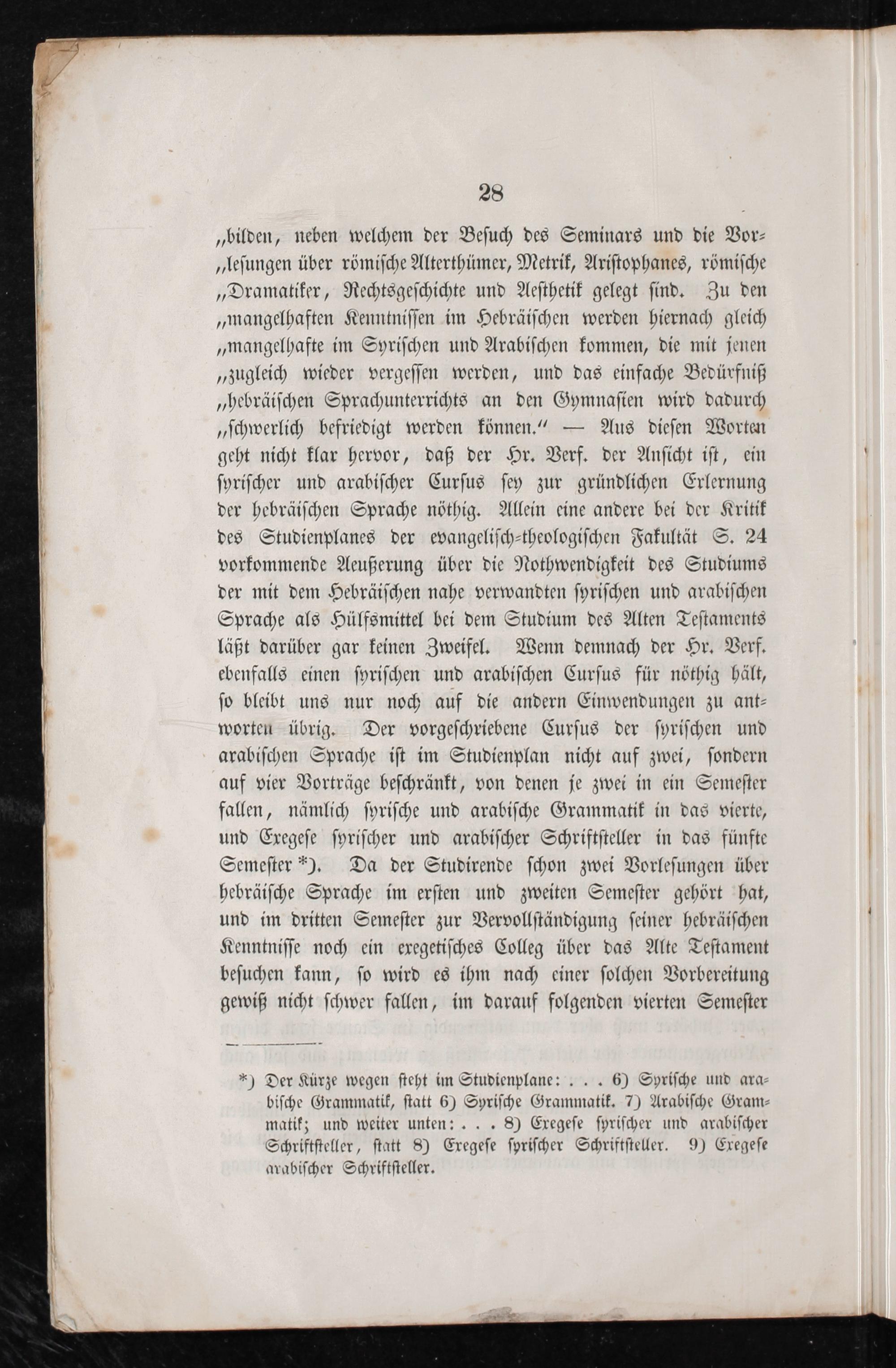 „bilden, neben welchem der Beſuch des Seminars und die Vor⸗ „leſungen über römiſche Alterthümer, Metrik, Ariſtophanes, römiſche „Dramatiker, Rechtsgeſchichte und Aeſthetik gelegt ſind. Zu den „mangelhaften Kenntniſſen im Hebräiſchen werden hiernach gleich „mangelhafte im Syriſchen und Arabiſchen kommen, die mit jenen „zugleich wieder vergeſſen werden, und das einfache Bedürfniß „hebräiſchen Sprachunterrichts an den Gymnaſien wird dadurch „ſchwerlich befriedigt werden können.“— Aus dieſen Worten geht nicht klar hervor, daß der Hr. Verf. der Anſicht iſt, ein ſyriſcher und arabiſcher Curſus ſey zur gründlichen Erlernung der hebräiſchen Sprache nöthig. Allein eine andere bei der Kritik des Studienplanes der evangeliſch⸗theologiſchen Fakultät S. 24 vorkommende Aeußerung über die Nothwendigkeit des Studiums der mit dem Hebräiſchen nahe verwandten ſyriſchen und arabiſchen Sprache als Hülfsmittel bei dem Studium des Alten Teſtaments läßt darüber gar keinen Zweifel. Wenn demnach der Hr. Verf. ebenfalls einen ſyriſchen und arabiſchen Curſus für nöthig hält, ſo bleibt uns nur noch auf die andern Einwendungen zu ant⸗ worten übrig. Der vorgeſchriebene Curſus der ſyriſchen und arabiſchen Sprache iſt im Studienplan nicht auf zwei, ſondern auf vier Vorträge beſchränkt, von denen je zwei in ein Semeſter fallen, nämlich ſyriſche und arabiſche Grammatik in das vierte, und Exegeſe ſyriſcher und arabiſcher Schriftſteller in das fünfte Semeſter*). Da der Studirende ſchon zwei Vorleſungen über hebräiſche Sprache im erſten und zweiten Semeſter gehört hat, und im dritten Semeſter zur Vervollſtändigung ſeiner hebräiſchen Kenntniſſe noch ein exegetiſches Colleg über das Alte Teſtament beſuchen kann, ſo wird es ihm nach einer ſolchen Vorbereitung gewiß nicht ſchwer fallen, im darauf folgenden vierten Semeſter