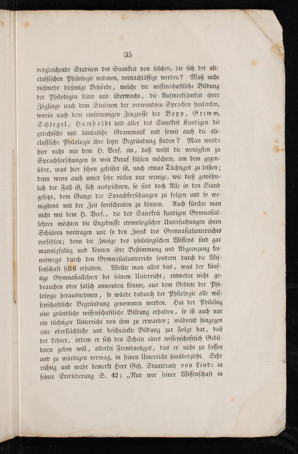 35 vergleichende Studium des Sanskrit von ſolchen, die ſich der alt claſſiſchen Philologie widmen, vernachläſſigt werden? Muß nicht vielmehr diejenige Behörde, welche die wiſſenſchaftliche Bildung der Philologen leitet und überwacht, die Aufmerkſamkeit ihrer Zöglinge nach dem Studium der verwandten Sprachen hinlenken, worin nach dem einſtimmigen Zeugniſſe der Bopp, Grimm, Schlegel, Humboldt und aller des Sanskrit Kundigen die griechiſche und lateiniſche Grammatik und ſomit auch die alt claſſiſche Philologie ihre letzte Begründung finden? Man wende hier nicht mit dem H. Verf. ein, daß wohl die wenigſten zu Sprachforſchungen ſo weit Beruf fühlen möchten, um dem gegen über, was hier ſchon geleiſtet iſt, noch etwas Tüchtiges zu leiſten; denn wenn auch unter ſehr vielen nur wenige, wie dieß gewöhn lich der Fall iſt, ſich auszeichnen, ſo ſind doch Alle in den Stand geſetzt, dem Gange der Sprachforſchungen zu folgen und ſo we nigſtens mit der Zeit fortſchreiten zu können. Auch fürchte man nicht mit dem H. Verf., die des Sanskrit kundigen Gymnaſial lehrer möchten die Ergebniſſe etymologiſcher Unterſuchungen ihren Schülern vortragen und ſo den Zweck des Gymnaſialunterrichts verfehlen; denn die Zweige des philologiſchen Wiſſens ſind gar mannigfaltig und können ihre Beſtimmung und Abgrenzung kei neswegs durch den Gymnaſialunterricht ſondern durch die Wiſ ſenſchaft ſelbſt erhalten. Wollte man alles das, was der künf tige Gymnaſiallehrer bei ſeinem Unterricht, entweder nicht ge brauchen oder falſch anwenden könnte, aus dem Gebiete der Phi lologie herausnehmen, ſo würde dadurch der Philologie alle wiſ⸗ ſenſchaftliche Begründung genommen werden. Hat der Philolog eine gründliche wiſſenſchaftliche Bildung erhalten, ſo iſt auch nur ein tüchtiger Unterricht von ihm zu erwarten; während hingegen eine oberflächliche und beſchränkte Bildung zur Folge hat, daß der Lehrer, indem er ſich den Schein eines wiſſenſchaftlich Gebil deten geben will, allerlei Fremdartiges, das er nicht zu faſſen und zu würdigen vermag, in ſeinen Unterricht hinüberzieht. Sehr richtig und wahr bemerkt Herr Geh. Staatsrath von Linde in ſeiner Erwiederung S. 42:„Nur wer ſeiner Wiſſenſchaft in