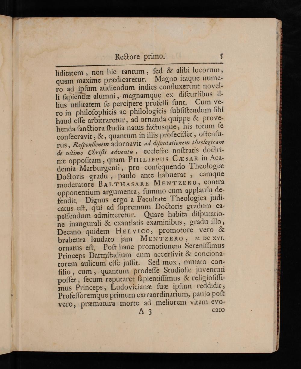 liditatem, non hie tantum, sed& alibi locorum, quam maxime prædicaretur. Magno itaque nume- ro ad ipsum audiendum indies confluxerunt novel- li sapientiæ alumni, magnamque ex discursibus il- lius utilitatem se percipere professi sunt. Cum ve. ro in philosophicis ac philologicis subsistendum sibi haud esse arbitraretur, ad ornanda quippe& prove- henda sanctiora studia natus factusque, his tõtum se consecravit,&, quantum in illis profecisset, ostensu- rus, Responsionem adornavit disputationem theblogicam de ulimo Christi advents, ecclesiæ nostratis docri- næ oppositam, quam PHILIPS CHSAR in Aca- demia Marburgensi, pro consequendo Theologiæ Doctoris gradu, paulo ante habuerat, eamque moderatore BALTHASARE MENTZERO, contra opponentium argumenta, summo cum applausu de- fendit. Dignus ergo a Facultate Theologica judi- catus est, qui ad supremum Doctoris gradum ca- pessendum admitteretur. Quare habita disputatio- ne inaugurali& exantlatis examinibus, gradu illo, Decano quidem HELVICO, promotore vero& brabeuta laudato jam MENT ZERO NM De Xyl. ornatus est. Post hanc promotionem Serenissimus Princeps Darmstadium eum accersivit& conciona- torem aulicum esse jussit. Sed mox, mutato con- silio, cum, quantum prodesse Studiosæ juventuti posset, secum reputaret sapientissimus& religiosissi- mus Princeps, Ludovicianæ suæ ipsum reddidit, Professoremque primum extraordinarium, paulo post vero, præmatura morte ad meliorem vitam evo- A 4 cato