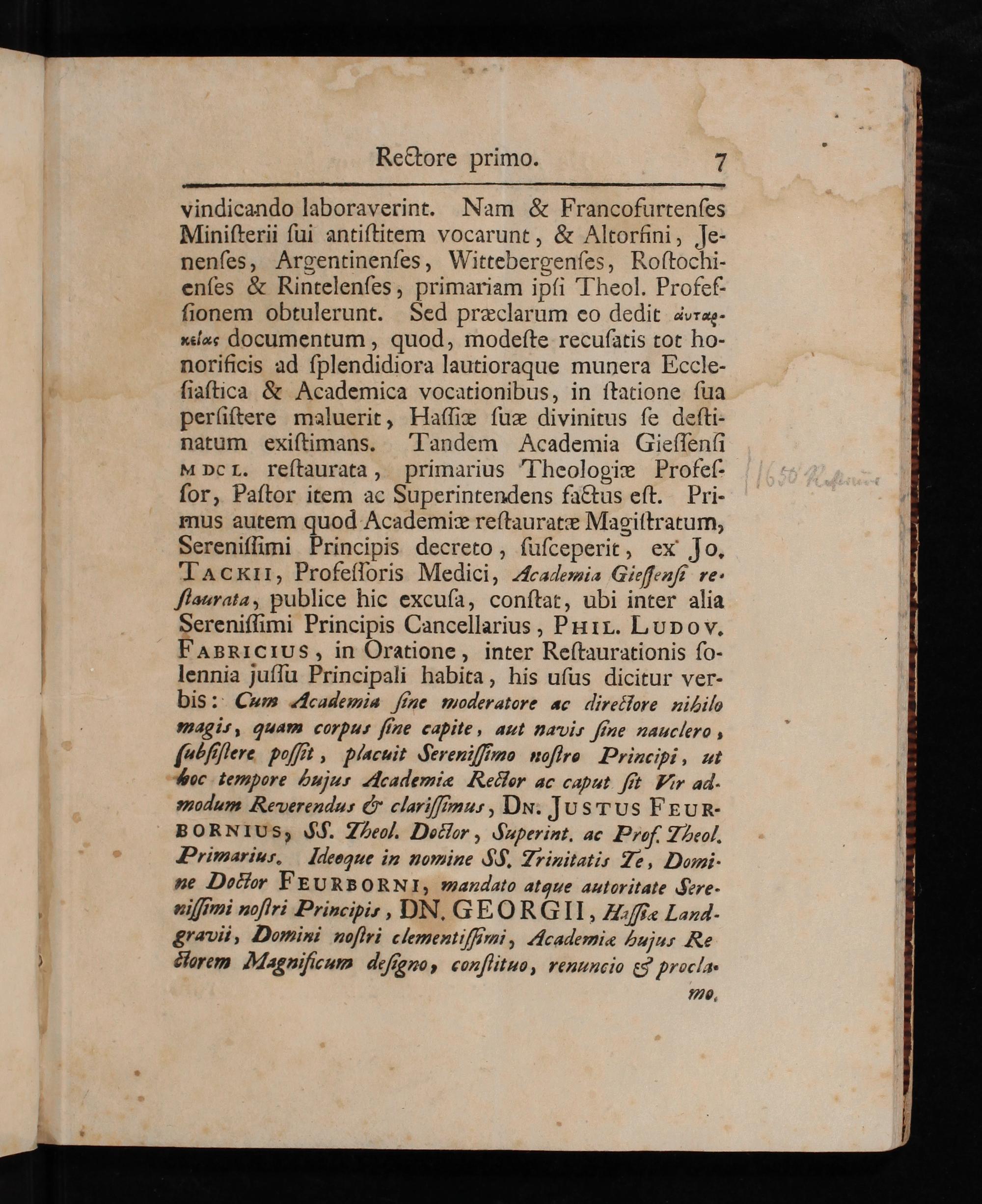 ABRICI Us, in Oratione, inter Restaurationis so- lennia jussu Principali habita, his usus dicitur ver- bis: Cum Academia sine moderatore ac directore nibilo magis, quam corpus sine capite, aut navis sine nauclero, sabsostere possit, placuit Cerenissimo nostro Principi, ut Hoc tempore Gujus Academiæ Rector ac caput sit Vir ad. modum Rewerendus& clarissimus, Dx. Jusrus FREURZ BORNIUS, SJ. Theol. Doclor, Juperint. ac Prof. Teol. Primarius. Iaeeque in nomine Q J. Trinitatis Ze, Domi ne Doctor FEURBORNI, mandato atque autoritate ere. uissimi nosiri Principis, DN. GEO RGII, Aiste Land. gravii, Domini nostri clementissimi, Academiæ gujur Re ciorem Magnisicum desgno, constituo, renuncio e procla.