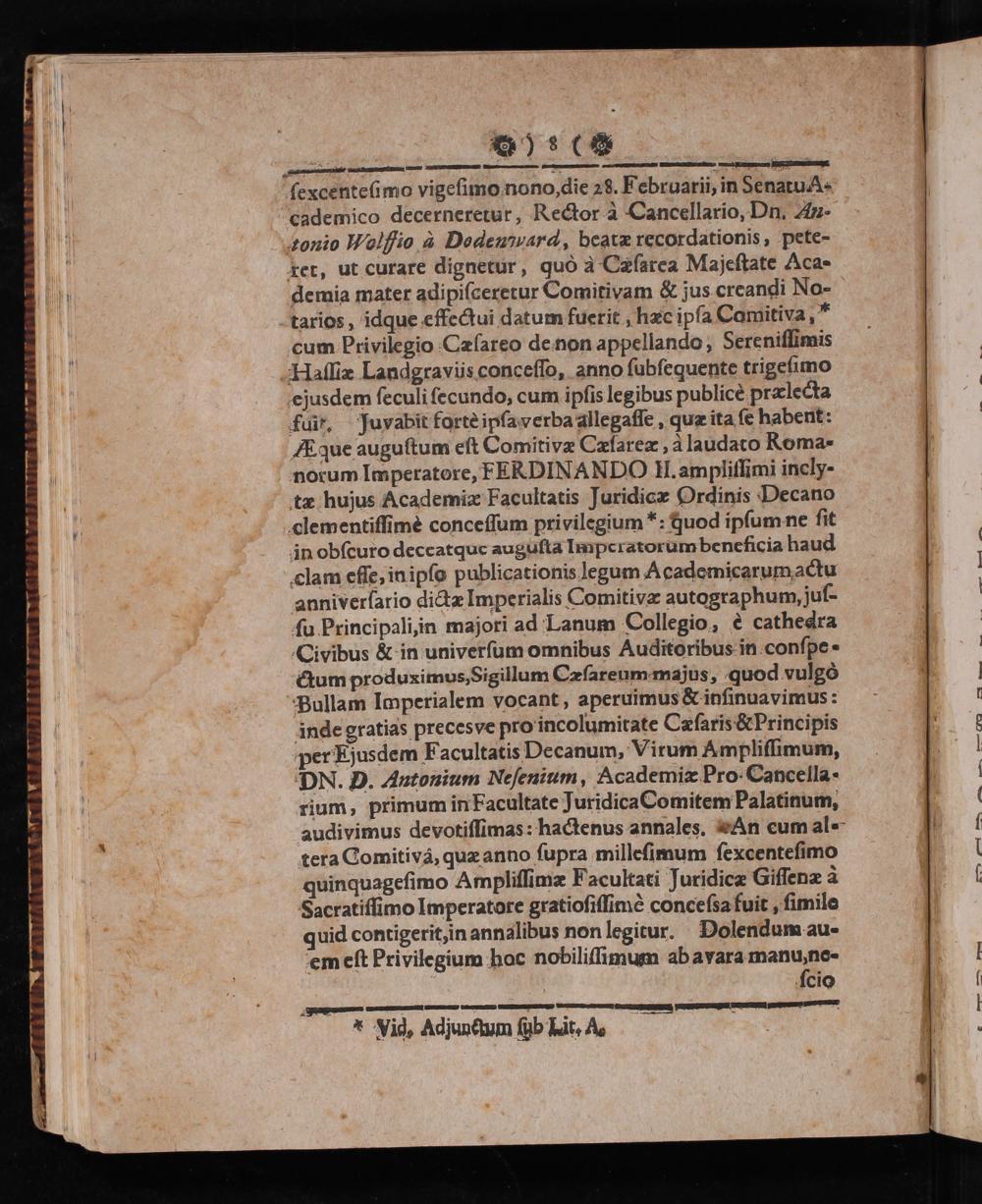 ejusdem seculi secundo, cum ipsis legibus publicè prælecta fait. Juvabit forte ipsa verba allegasse, quæ ita se habent: A que augustum est Comitivæ Cæsarem à laudato Roma- norum Imperatore, EERDINANDO II. amplissimi incly- tæ hujus Academiæ Facultatis Juridicæ Ordinis Decano clementissimè concessum privilegiumꝰ: quod ipsum ne sit in obscuro deceatque augusta Imperatorum beneficia haud elam esse, in ipso publicationis legum Academicarum actu anniversario dictæ Imperialis Comitivæ autographum, jus- su Principali, in majori ad Lanum Collegio, e cathedra Civibus& in universum omnibus Auditoribus in conspe · ctum produximus, Sigillum Cæsareum majus, quod vulgò Bullam Imperialem vocant, aperuimus& insinuavimus: inde gratias preces ve pro incolumitate Cæsaris& Principis per Ejusdem Facultatis Decanum, Virum Amplissimum, DN. D. Autonium Nesenium, Academiæ Pro. Cancella- rium, primum in Eacultate Juridica Comitem Palatinum, audivimus devotissimas: hactenus annales. An eum al- tera Comitivã, quæ anno supra millesimum sexcentesimo quinquagesimo Amplissimæ Facultati Juridicæ Gissenæ 2 Sacratissimo Imperatore gratiosissimè concessa fuit, simile quid contigerit, in annalibus non legitur. Dolendum au- em est Privilegium hoc nobilissimum ab avara manu no- scio