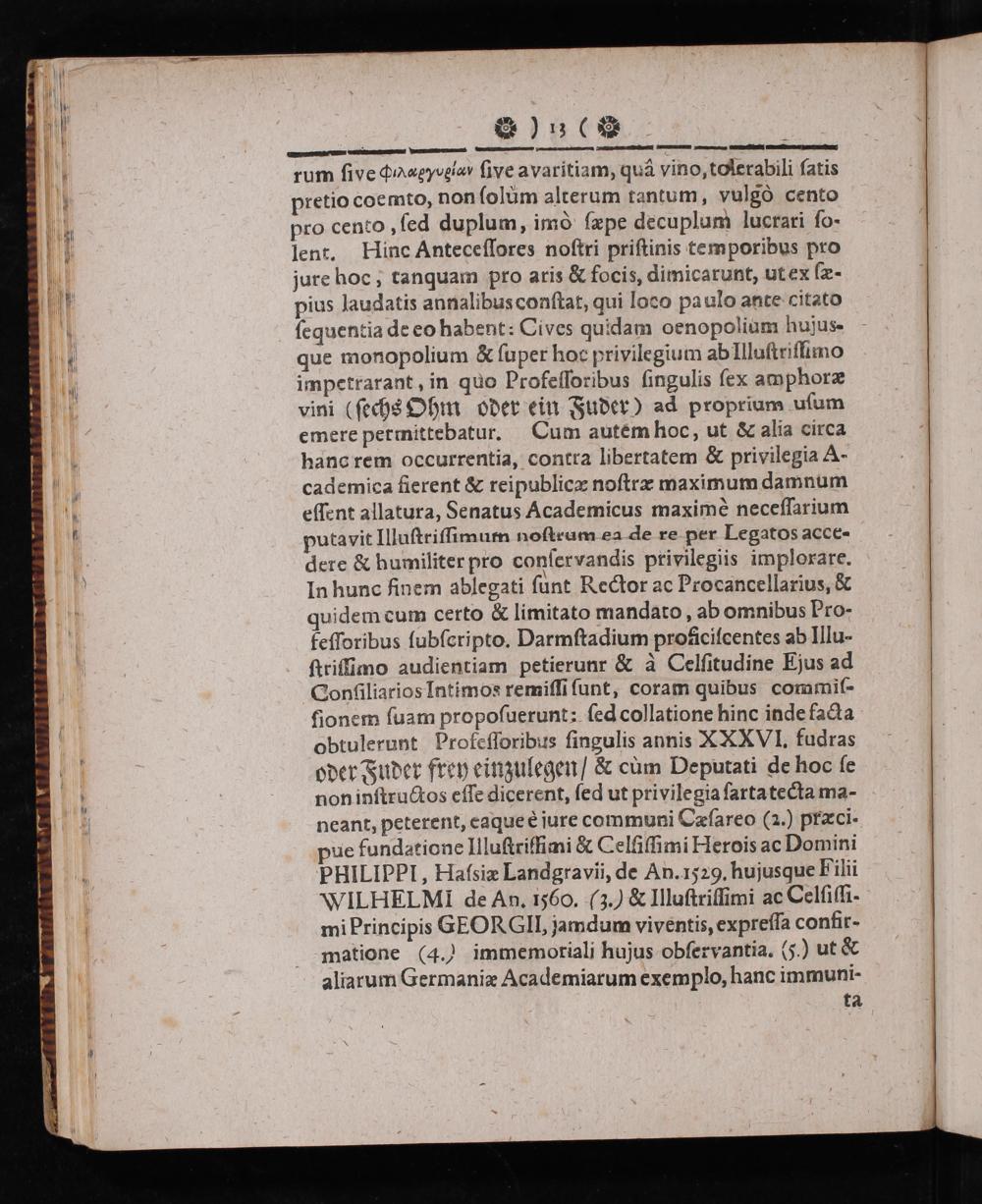 rum sive ανννεαun sive a varitiam, quã vino, tolerabili satis pretio coemto, non solum alterum tantum, vulgò cento pro cento, sed duplum, imò sæpe decuplum lucrari so- lent. Hine Antecessores nostri pristinis te mporibus pro jure hoc; tanquam pro aris& foeis, dimicarunt, ut ex sæ- pius laudatis annalibus constat, qui loco paulo ante citato sequentia de eo habent: Cives quidam oenopolium hujus- que monopolium& super hoc privilegium ab Illustrissimo impetrarant, in quo Professoribus singulis sex amphoræ vini(sechs Ohm oder ein Fuder) ad proprium usum emere permittebatur. Cum autem hoc, ut& alia circa hanc rem occurrentia, contra libertatem& privilegia A- cademica fierent& reipublicæ nostræ maximum damnum essent allatura, Senatus Academicus maximè necessarium putavit Illustrissimum nosteum ea de re per Legatos acee- dere& humiliter pro conservandis privilegiis implorare. In hunc sinem ablegati sunt Rector ac Procancellarius,& quidem eum certo& limitato mandato, ab omnibus Pro- fessoribus subseripto. Darmstadium proficiseentes ab Illu- strisimo audientiam petierunr& à Celsitudine Ejus ad Consiliarios Intimos remissi sunt, coram quibus commis- fionem suam proposuerunt; sed collatione hinc inde facta obtulerunt Professoribus singulis annis XXXVI. fudras oder Fuder frey einzulegen/& cum Deputati de hoc se non instructos esse dicerent, sed ut privilegia sarta tecta ma- neant, peterent, eaque è jure communi Cæsareo(.) præci. pue fundatione Illustriffimi& Celsissimi Herois ae Domini pHILIPPI, Hatsiæ Landgravii, de An. 1529. hujusque Filii WILHELM de An. 1560.(g.)& Illustrissimi ac Celsissi- mi Principis GEORGll, jamdum viventis, expressa confir- matione(4.) immemoriali hujus observantia.(.) ut& aliarum Germaniæ Academiarum exemplo, hanc immuni-