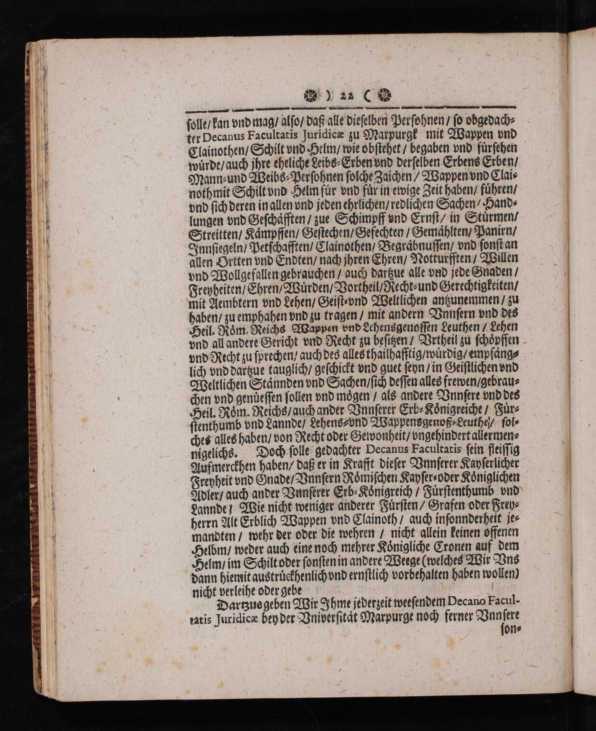solle/ kan vnd mag/ also/ daß alle dieselben Persohnen/ so odgedach⸗ ter Decanus Facultatis Juridica zu Marpurgk mit Wappen vnd Clainothen/ Schilt vnd Helm/ wie obstehet/ begaben vnd fuͤrsehen wuͤrde/ auch jhre eheliche Leibs⸗Erben vnd derselben Erbens Erben/ Mann; und Weibs⸗Persohnen solche Zachen/ Wappen vnd Clai⸗ nothmit Schilt vnd Helm fur vnd für in ewige Zeit haben/ fuhren/ vnd sich deren in allen vnd jeden ehrlichen/ redlichen Sachen Hand⸗ lungen vnd Geschaͤfften/ zue Schimoff vnd Ernst/ in Stürmen/ Streitten/ Kaͤmpffen/ Gestechen/ Gefechten/ Gemahlten/ Panirn/ Innsiegeln/ Petschafften/ Clainothen/ Begraͤbnussen/ vnd sonst an allen Ortten vnd Endten/ nach jhren Ehren/ Notturfften/ Willen vnd Wollgefallen gebrauchen/ auch dartzue alle vnd jede Gnaden/ Freybdeiten/ Ehren/ Wuͤrden/ Vortheil) Recht⸗ und Gerechtigkeiten/ mit Aembtern vnd Lehen/ Geist⸗vnd Weltlichen antzunemmen/ zu haben/ zu emphahen vnd zu tragen/ mit andern Vnnsern vnd des Heil. Rom. Reichs Wappen vnd Lehensgenossen Leuthen! Lehen vnd all andere Gericht vnd Recht zu besitzen/ Vrtheil zu schoͤpffen vnd Recht zu sprechen/ auch des alles thailhafftig/ wuͤrdig⸗ empfaͤng⸗ lich vnd dartzue tauglich/ geschickt vnd guet seyn/ in Geistlichen vnd Weltlichen Staͤnnden vnd Sachen/ sich dessen alles frewen/ gebrau⸗ chen vnd genũessen solien vnd moͤgen/ als andere Vnnsere vnd des Heil. Roͤm. Reichs/ auch ander Vnnserer Erb⸗Koͤnigreiche/ Fuͤr⸗ stenthumb vnd Lannde/ Lehens⸗ vnd Wappensgenoß⸗Leuthel/ sol⸗ ches alles haben/ von Recht oder Gewonheit/ vngehindert allermen⸗ nigelichs. Doch solle gedachter Pecanus Facultatis sein fftissig Aufmerckhen haben/ daß er in Krafft dieser Vnnserer Kayserlicher Freyheit vnd Gnade Vnnsern Röͤmischen Kayser⸗oder Königlichen Adler/ auch ander Vunserer Erb⸗Koͤnigreich/ Fuͤrstenthumb vnd Lannde! Wie nicht weniger anderer Fuͤrsten/ Grafen oder Frey⸗ herrn Alt Erblich Wappen vnd Clainoth/ auch insonnderheit je⸗ mandten/ wehr der oder die wehren/ nicht allein keinen offenen Helbm/ weder auch eine noch mehrer Königliche Cronen auf dem Helm/ im Schilt oder sonsten in andere Weege(welches Wir Vns dann hiemit austruͤckhenlich vnd ernstlich vorbehalten haben wollen) nicht verleihe oder gebe ö Dartzue geben Wir Ihme jederzeit weesendem Decano Facul⸗ atis Juridicæ bey der Vnibersitat Marpurge noch ferner 9 on⸗