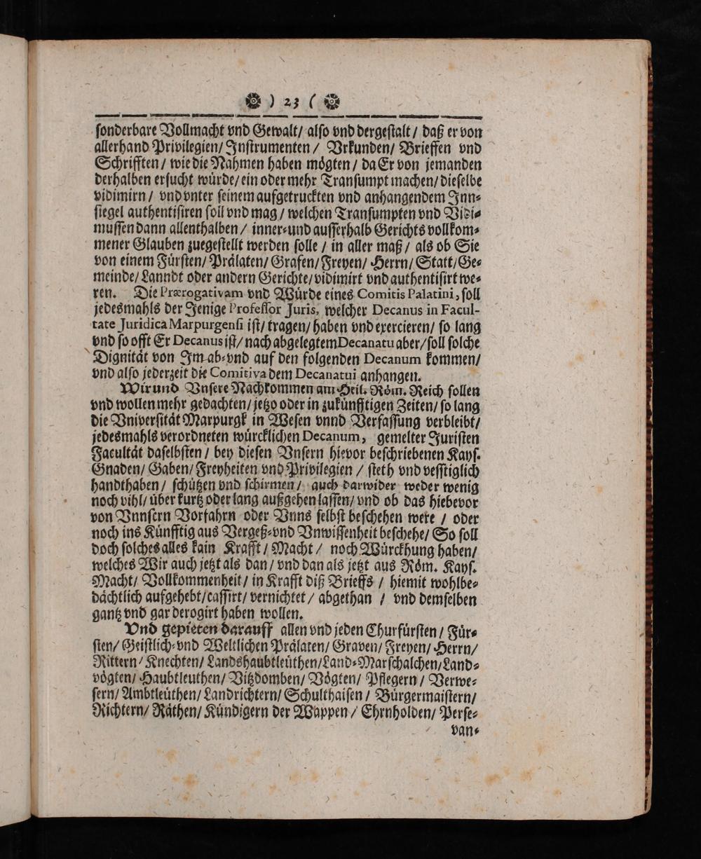sonderbare Vollmacht vnd Gewalt/ also vnd dergestalt/ daß er von allerhand Privilegien/ Instrumenten/ Vrkunden/ Brieffen vnd Schrifften/ wie die Nahmen haben moͤgten/ da Er von jemanden derhalben ersucht wuͤrde/ ein oder mehr Transumpt machen/ dieselbe vidimirn/ vnd vnter seinem aufgetruckten vnd anhangendem Inn⸗ siegel authentisiren soll vnd mag/ welchen Transumpten vnd Vidi⸗ mussen dann allenthalben/ inner⸗ und ausserhalb Gerichts vollkom⸗ mener Glauben zuegestellt werden solle/ in aller maß/ als ob Sie von einem Fuͤrsten/ Praͤlaten/ Grafen/ Freyen/ Herrn/ Statt/ Ge⸗ meinde/ Lanndt oder andern Gerichte/ vidimirt vnd authentisirt we⸗ ren. Die Lrærogativam vnd Wuͤrde eines Comitis Palatini, soll jedesmahls der Jenige Professor Juris, welcher Decanus in Facul- tate Juridica Marpurgensi ist/ tragen/ haben vnd exercieren/ so lang vnd so offt Er Decanus ist/ nach abgelegtem Decanatu aber/ soll solche Dignitaͤt von Im ab⸗ vnd auf den folgenden Decanum kommen/ vnd also jederzeit die Comitiva dem Decanatui anhangen.