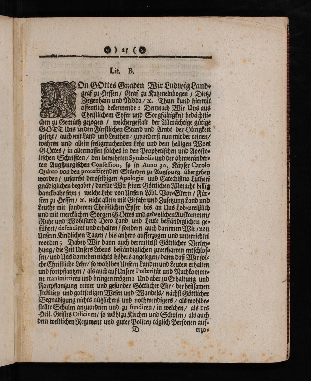 On Gottes Gnaden Wir Ludwig Land⸗ raf zu Hessen/ Graf zu Katzenelnbogen/ Dietz/ Zecenbain und Nidda/ ꝛc. Thun kund hiermit Pffentlich bekennende: Demnach Wir Uns aus E yhristlichem Eyfer und Sorglaltigkeit bedaͤchtli⸗