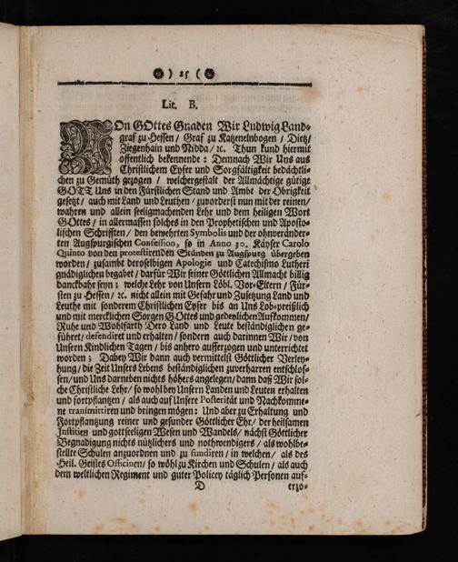 chen zu Gemuͤth gezogen/ welchergestalt der Allmaͤchtige guͤtige GOTT Uns in den Fuͤrstlichen Stand und Ambt der Obrigkeit gesetzt/ auch mit Land und Leuthen/ zuvorderst nun mit der reinen/ wahren und allein seeligmachenden Lehr und dem heiligen Wort Gottes/ in allermassen solches in den Prophetischen und Aposto⸗ lischen Schrifften/ den bewehrten Symbolis und der ohnverander⸗ ten Augspurgischen Confession, so in Anno go. Kaͤyser Carolo Quinto von den protestirenden Standen zu Augspurg uͤbergeben worden/ zusambt deroselbigen Apologie und Catechismo Lutheri gnaͤdiglichen begabet/ darfuͤr Wir seiner Goͤttlichen Allmacht billig danckbahr seyn; welche Lehr von Unsern Loͤbl. Vor⸗Eltern/ Fuͤr⸗ sten zu Hessen/ ꝛc. nicht allein mit Gefahr und Zusetzung Land und Leuthe mit sonderem Christlichen Eyfer bis an Uns Lob⸗preißlich und mit mercklichen Sorgen G Ottes und gedevlichen Aufkommen/ Ruhe und Wohlfarth Dero Land und Leute bestaͤndiglichen ge⸗ fͤhret/ defendiret und erhalten/ sondern auch darinnen Wir/ von Unsern Kindlichen Tagen/ bis anhero aufferzogen und unterrichtet worden; Dabey Wir dann auch vermittelst Goͤttlicher Verley⸗ hung/ die Zeit Unsers Lebens bestaͤndiglichen zuverharren entschlos⸗ sen/ und Uns darneben nichts hoͤhers angelegen/ dann daß Wir sol⸗ che Christliche Lehr/ so wohl bey Unsern danden und Leuten erhalten und fortpflantzen/ als auch auf Unsere Posteritaͤt und Nachkomme⸗ ne transmittiren und bringen moͤgen: Und aber zu Erhaltung und Fortpflantzung reiner und gesunder Gottlicher Ehr/ der heilsamen Jstitien und gottseeligen Wesen und Wandels/ naͤchst Goͤttlicher Begnadigung nichts nuͤtzlichers und nothwendigers/ als wohlbe⸗ stellte Schulen anzuordnen und zu fundiren/ in welchen/ als des Beil. Geistes Ofkicinen/ so woͤhlzu Kirchen und Schulen/ als auch dem weltlichen Regiment und guter 8 taͤglich Personen auf⸗ erzo⸗