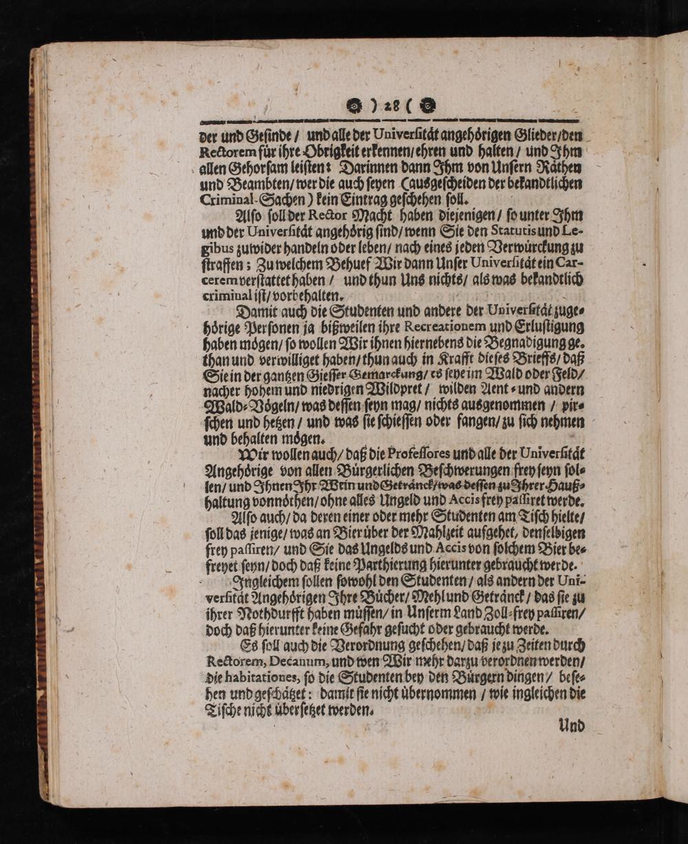 Wir wollen auch/ daß die Professores und alle der Uniersitdt Angehoͤrige von allen Buͤrgerlichen Beschwerungen frey seyn sol⸗ len/ und Ihnen Ihr Wein und Getranek/ was dessen zu Ihrer Hauß⸗ haltung vonnöͤthen/ ohne alles Ungeld und Accis frey passiret werde.