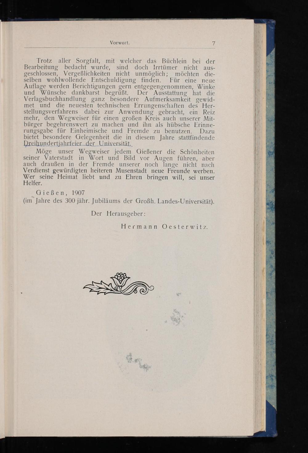 Möge unser Wegweiser jedem Gießener die Schönheiten seiner Vaterstadt in Wort und Bild vor Augen führen, aber auch draußen in der Fremde unserer noch lange nicht nach Verdienst gewürdigten heiteren Musenstadt neue Freunde werben. Wer seine Heimat liebt und zu Ehren bringen will, sei unser Helfer.