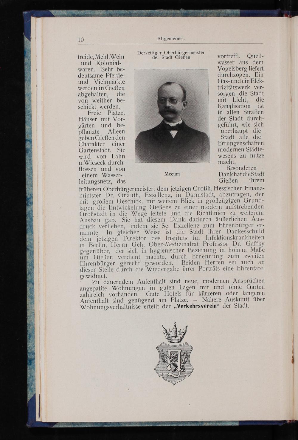 früheren Oberbürgermeister, dem jetzigen Großh. Hessischen Finanz- minister Dr. Gnauth, Exzellenz, in Darmstadt, abzutragen, der mit großem Geschick, mit weitem Blick in großzügigen Grund- lagen” die Entwickelung Gießens zu einer modern aufstrebenden Großstadt in die Wege leitete und die Richtlinien zu weiterem Ausbau gab. Sie hat diesem Dank dadurch äußerlichen Aus- druck verliehen, indem sie Se. Exzellenz zum Ehrenbürger er- nannte. In gleicher Weise ist die Stadt ihrer Dankesschuld dem jetzigen Direktor des Instituts für Infektionskrankheiten in Berlin, Herrn Geh. Ober-Medizinalrat Professor Dr. Gaffky gegenüber, der sich in hygienischer Beziehung in hohem Maße um Gießen verdient machte, durch Ernennung zum zweiten Ehrenbürger gerecht geworden. Beiden Herren sei auch an dieser Stelle durch die Wied ergabe ihrer Porträts eine Ehrentafel gewidmet.