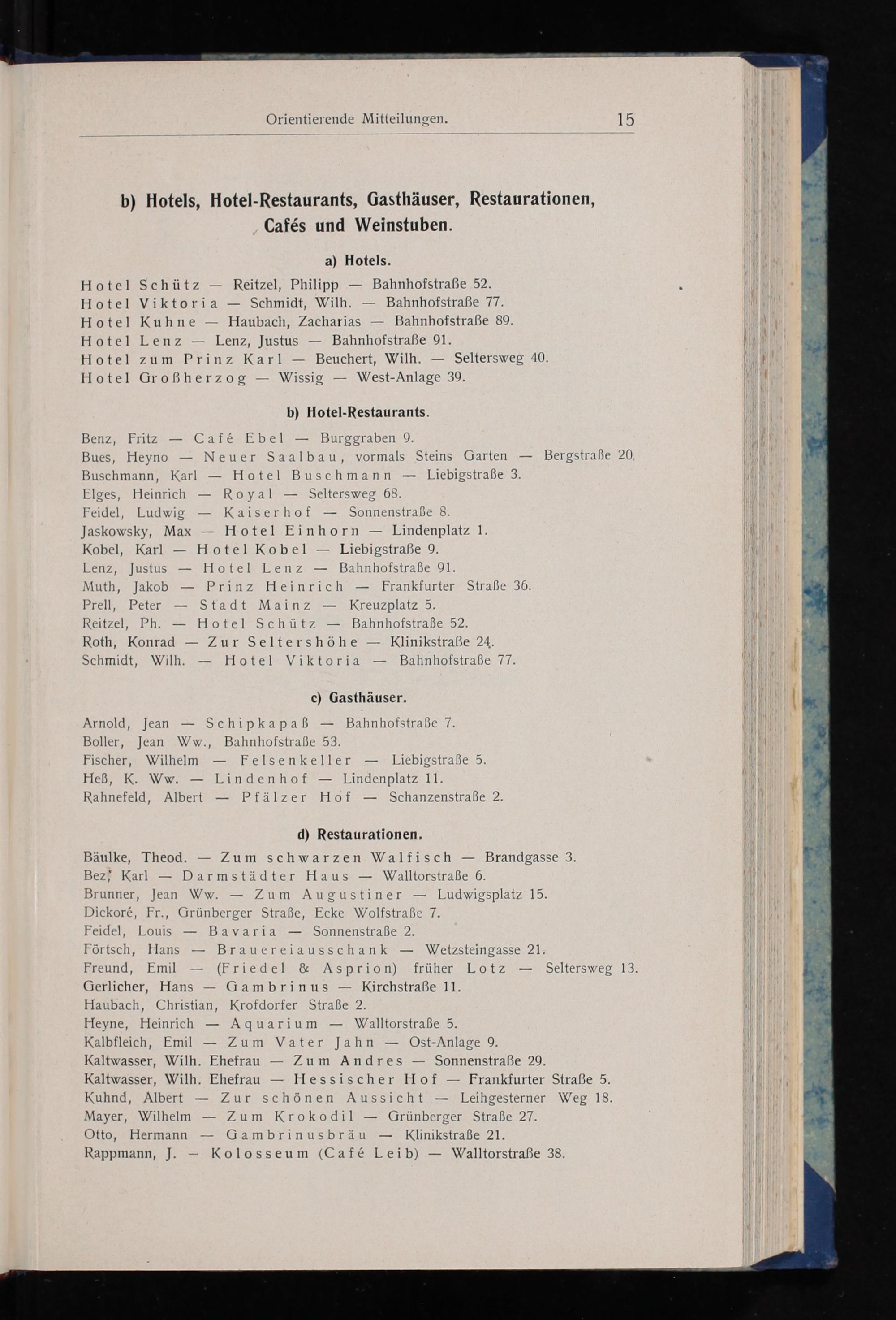a) Hotels. Hotel Schütz— Reitzel, Philipp— Bahnhofstraße 52. Hotel Viktoria— Schmidt, Wilh.— Bahnhofstraße 77. Hotel Kuhne— Haubach, Zacharias— Bahnhofstraße 89. Hotel Lenz— Lenz, Justus— Bahnhofstraße 91. Hotel zum Prinz Karl— Beuchert, Wilh.— Seltersweg 40.