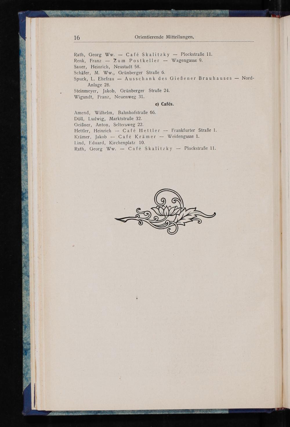 i| Rath, Georg Ww.— Caf& Skalitzky— Plockstraße 11.| Renk, Franz— Zum Postkeller— Wagengasse 9. Sauer, Heinrich, Neustadt 58. Schäfer, M. Ww., Grünberger Straße 6. Spuck, L. Ehefrau— Ausschank des Gießener Brauhauses— Nord-