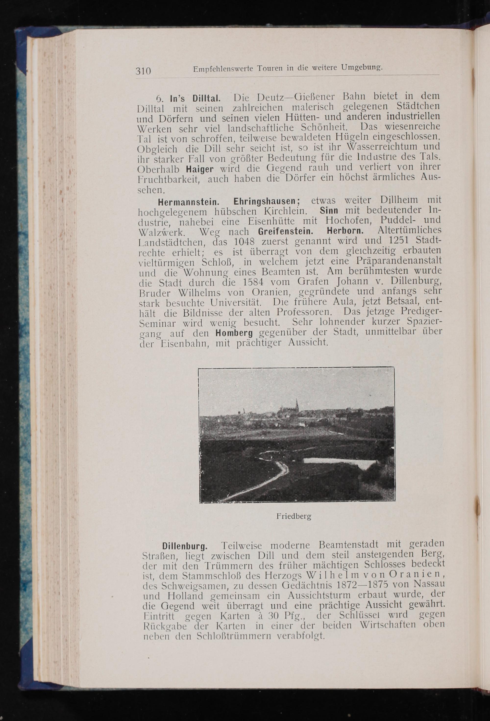 N Hermannstein. Ehringshausen; etwas weiter Dillheım mit hochgelegenem hübschen Kirchlein._ Sinn mit bedeutender In- dustrie, nahebei eine Eisenhütte mit Hochofen, Puddel- und Walzwerk. Weg a Greifenstein. Herborn. Altertümliches Landstädtchen, das 1048 zuerst genannt wird und 1251 Stadt- rechte erhielt; es ist überragt von dem gleichzeitig erbauten ae Schloß, in welchem jetzt eine Pr räparandenanstalt und die"Wohnung eines Beamten ıst. Am berühmtesten wurde die Stadt durch die 1584 vom Grafen Johann v. Dillenburg, Bruder Wilhelms von Oranien, gegründete und anfangs sehr stark besuchte Universität. Die frühere Aula, jetzt Betsaal, ent- hält die Bildnisse der alten Professoren. Das jetzige Prediger- Seminar wird wenig besucht. Sehr lohnender kurzer Spazier- sang auf den Homberg gegenüber der Stadt, unmittelbar über der Eisenbahn, mit prächtiger Aussicht.