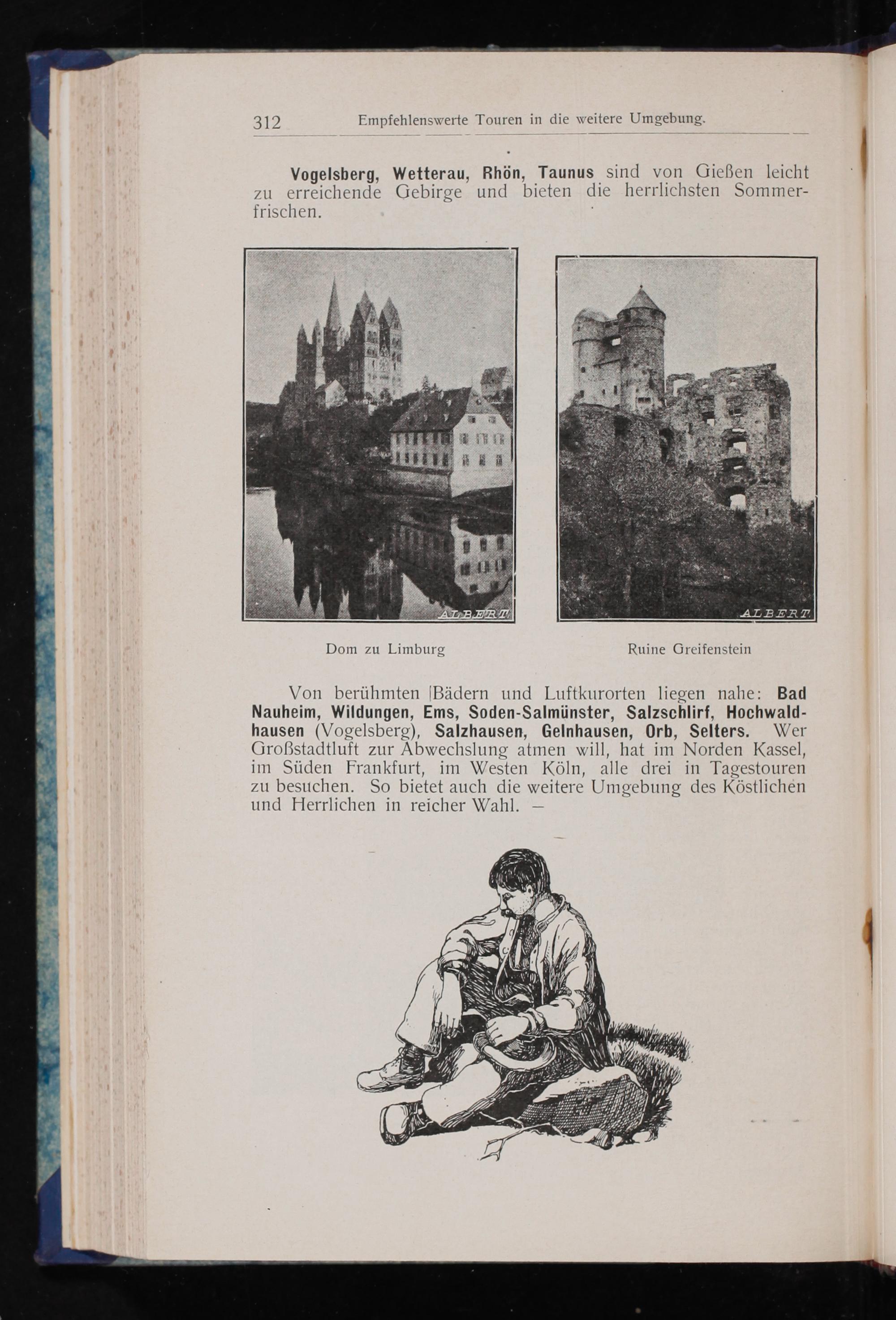 Von berühmten[Bädern und Luftkurorten liegen nahe: Bad Nauheim, Wildungen, Ems, Soden-Salmünster, Salzschlirf, Hochwald- hausen(Vogelsberg), Salzhausen, Gelnhausen, Orb, Selters.\Ver Großstadtluft zur Abwechslung atmen will, hat im Norden Kassel, im Süden Frankfurt, im Westen Köln, alle drei in Tagestouren zu besıuichen. So bietet auch die weitere Umgebung des Köstlichen und Herrlichen in reicher Wahl.—