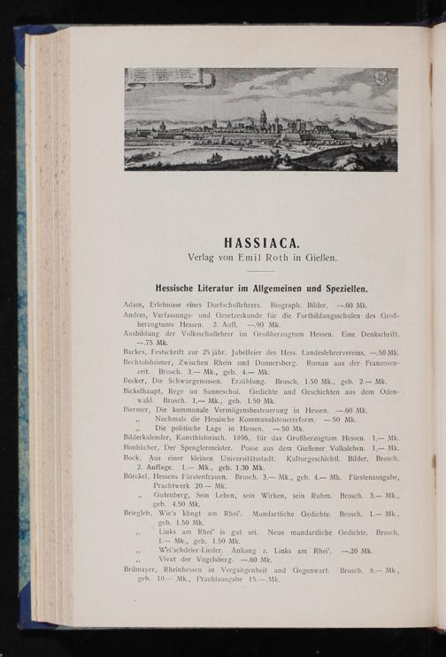 Bilderkalender, Kunsthistorisch. 1896, für das Großherzogtum Hessen. 1.— Mk. Bimbächer, Der Spenglermeister. Posse aus dem Gießener Volksleben. 1.— Mk. Bock, Aus einer kleinen Universitätsstadt. Kulturgeschichtl. Bilder. Brosch. 2. Auflage. 1.— Mk., geb. 1.30 Mk. Börckel, Hessens Fürstenfrauen. Brosch. 3,— Mk., geb. 4.— Mk. Fürstenausgabe, Prachtwerk 20.— Mk. », Gutenberg, Sein Leben, sein Wirken, sein Ruhm. Brosch. 3.— Mk., geb. 4.50 Mk. Zriegleb, Wie’s klingt am Rhei’. Mundartliche Gedichte. Brosch. 1.— Mk., geb. 1.50 Mk.