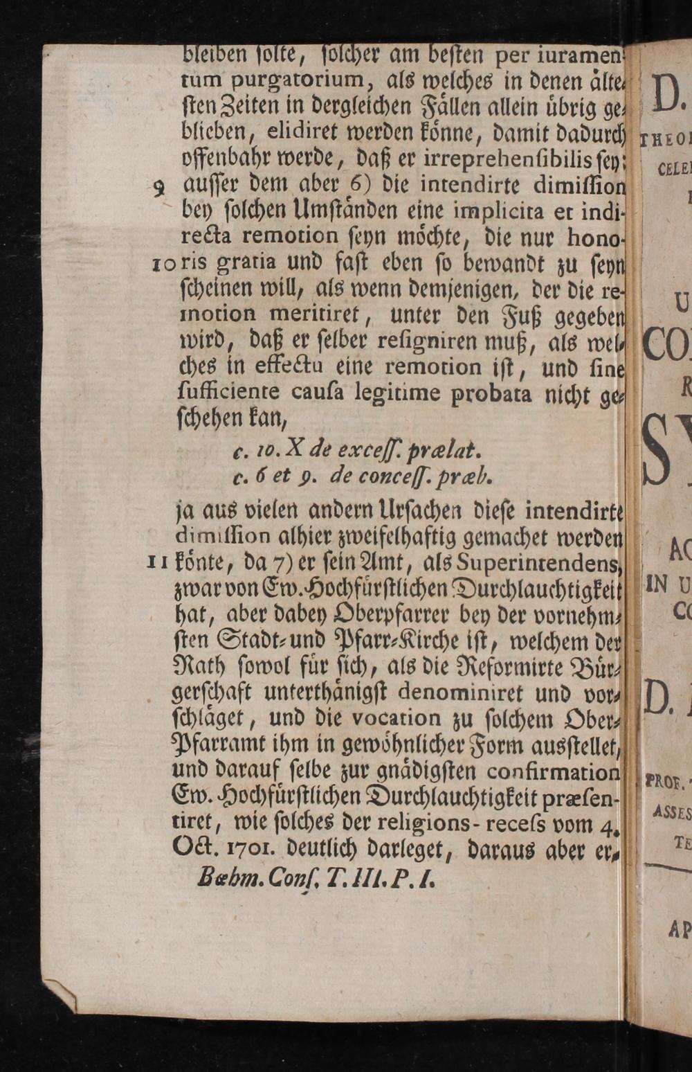 auſſer dem aber 6) die intendirte dimiſſion bey ſolchen Umſtaͤnden eine implicita et indi- recta remotion ſeyn moͤchte, die nur hono⸗ 10 ris gratia und faſt eben ſo bewandt zu ſeyn ſcheinen will, als wenn demjenigen, der die re⸗ inotion meritiret, unter den Fuß gegeben wird, daß er ſelber reſigniren muß, als wel⸗ ches in effectu eine remorion iſt, und ſine ſufficiente cauſa legitime probata nicht ge⸗