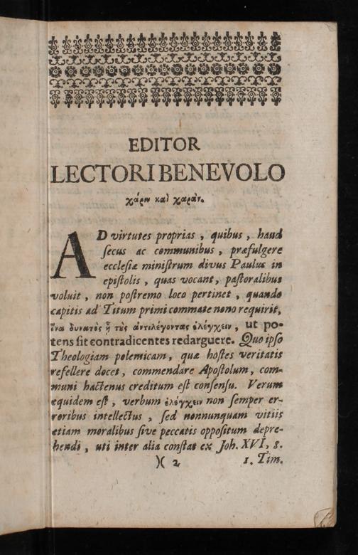 ⁴e val Laæedr. D virtutes proprias, quibus, haud A ſecus ac communibus, præfulgere eccleſiæ miniſtrum divus Paulus in epiſtolis, quas vocant᷑, paftoralibus voluit, non poſtremo loco pertinet, quando cæpitis ad Titum primi commate nona requirit, 7,2à Jorarde J rds Aeratyovras&Aνεν, ut Po- tens ſit eontradicentes redarguere. Quo ipſs Theologiam polemicam, quæ hoſtes veritatis refellere docet, commendare Kpoſlolum, com- muni hactenus creditum eſt conſenſu. Verum equidem eſt, verbum insκνs non ſemper er- roribus intellectus, ſed nonnunquam vitiis etiam moralibus ſive peccatis oppoſitum depre- bendi, uti inter alia conſtat ex fob. III, S.