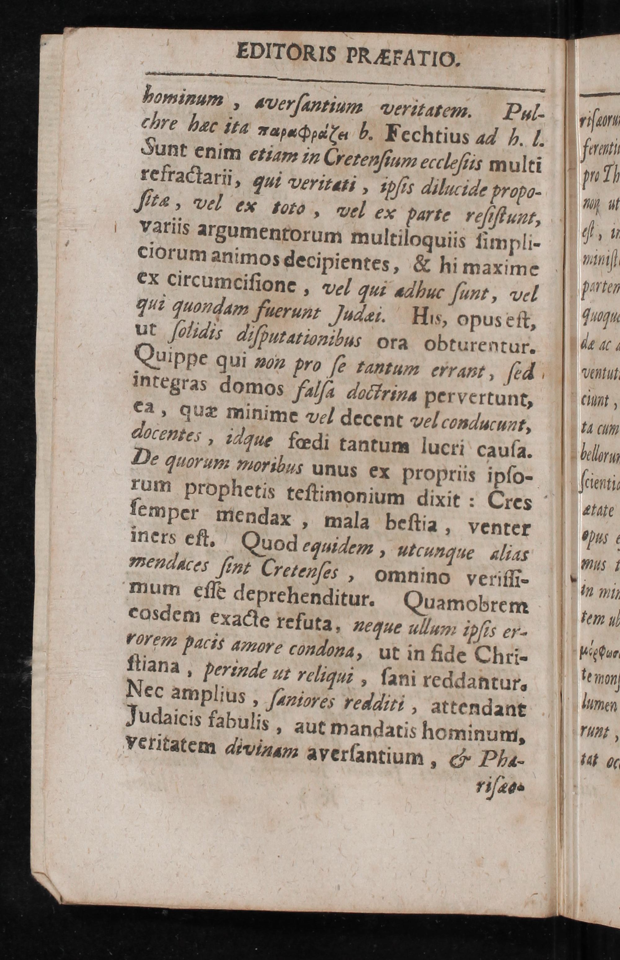 EDITORIS PRFfFATIO. —--—— bominaum, wverſantzium veritarem. Dul- Chre hec ita Tapacν b. Fechtius aa Ä. I. Sunt enim etiam in Cretenſium ecclæſiis multi refractarii, qui veritai ipſir diluide propo- ſiræ, vel exr toto, vel ex Parte reſiſtunt, Variis argumentorum multiloquiis ſimpli- ciorum animos decipientes,& hi maxime ex circumciſione, vol qui adbuc ſunt, vel Tui quondam fuerunt Judæi. His, opus eſt, ut ſoliats aiſputationibus ora obturentur.