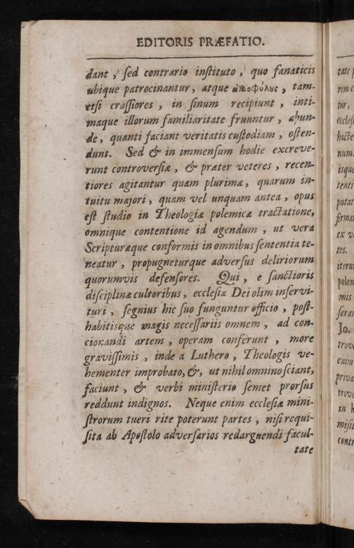 dant, ſed contraris inſtituto, quo fanaticis ubique patrocinantur, atque Anoqpð, tam- etſe craſſiores, in ſinam recipiunt, inti- maque illorum familiaritate frunntur, abun- de, quanti faciant veritatis cuſtodiam, oſten- dant. Sed& in mmenſum hodie excreve- runt controverſiæ,& prater veteres, recen tiores agitantur quam plurimæ, quarum in- tuitu majori, quam vel unquam autea, pus eſt ſtudio in Theologiæ polemicæ tractatione, omnique contentione id agenqum, ut vera Scripturæque confor mis in omnibus ſententia te- nearur, propugneturque aaverſus deliriorum quorumvis defenſores. Qui, e ſanclioris aiſciplinæ cultoribus, eccleſiæ Dei olim inſerwi⸗