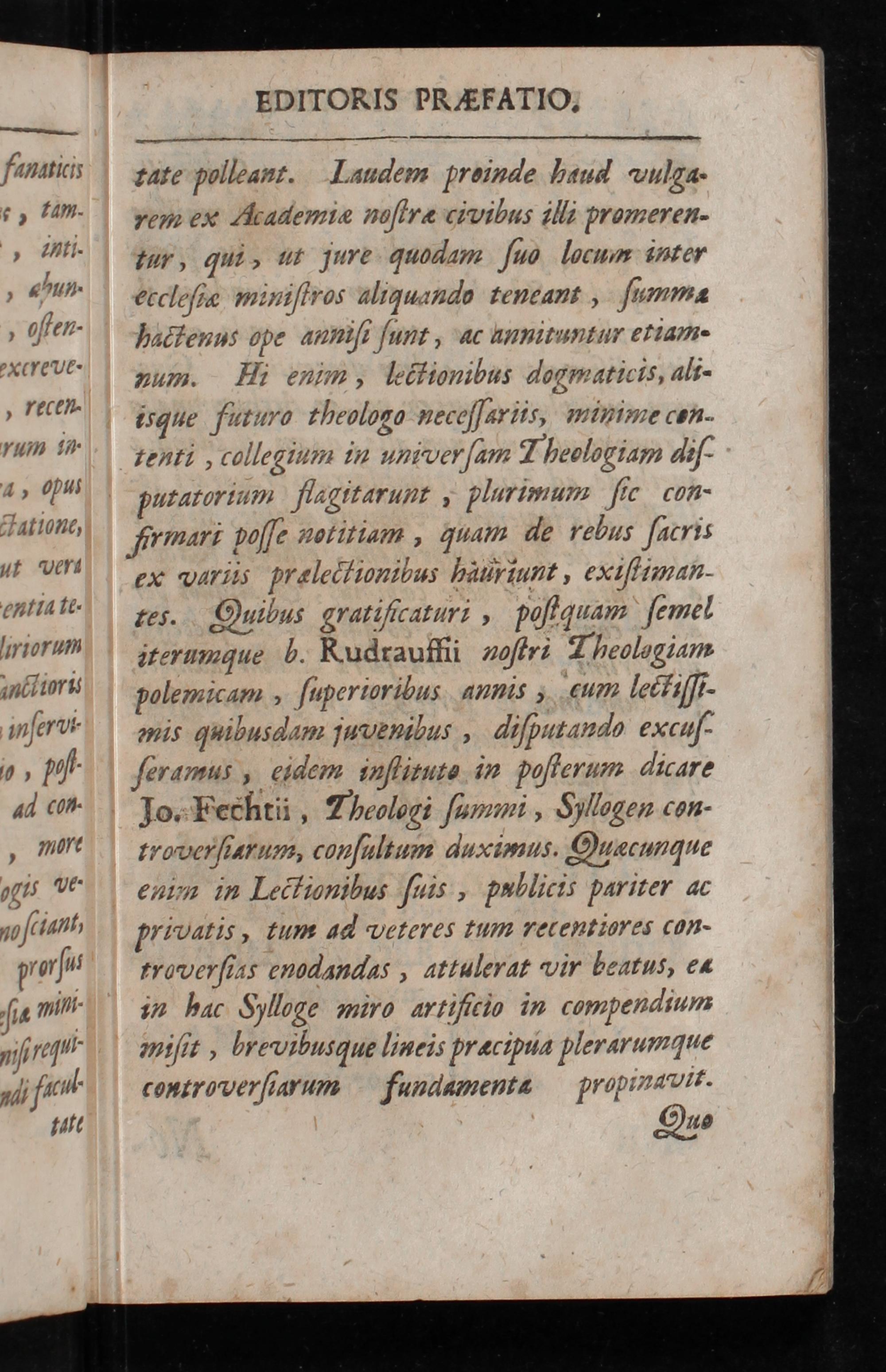 tate polleant. Laudem preinde haud vulga- rem ex Mademiæ noſtræ civibus illi promeren- tur, qui, ut jure quodom ſuo locum inter eccleſiæ miniſtros aliquando teneant, ſumma hactenus ope anniſi funt, ac annituntur etiam- num. Hi enim, lettionibus dogmaticis, ali- isque futuro theologo neceſſariis, minime cen- tenti, collegium in univerſam 7. heologiam diſ- putarorium flagitarunt, plurimum ſic con- firmari poſſe notitiam, quam de rebus ſacris ex variis præleclionibus hauriunt, exiſßtiman- tes. Quibus graxiftaturi, poftquam ſemel iterumque b. Rudrauffii noſtri Iheologiam polemicam, ſuperioribus annis, tum lectiſſt- mis quibusdam juvenibus, diſpurando excuſ fſeramus, eidem inſtitute in poſterum dicare Jo. Fechtii. 2, heologi ſummi, S&llogen con- troverſiarum, conſultum duximus. Quacunque enim in Lectionibus ſuis, pablicis pariter ac