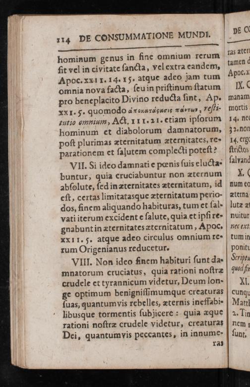 VII. Si ideo damnati e pœnis ſuis elucta- buntur, quia cruciabuntur non æternum abſolute, ſed in æternitates æternitatum, id eſt, certas limitatasque æternitatum perio- dos, finem aliquando habituras, tum et ſal⸗ vati iterum excident e ſalute, quia et ipſi re- gnabunt in æternitates æternitatum, Apoc. XII. 5. atque adeo circulus omnium re- rum Origenianus reducetur.