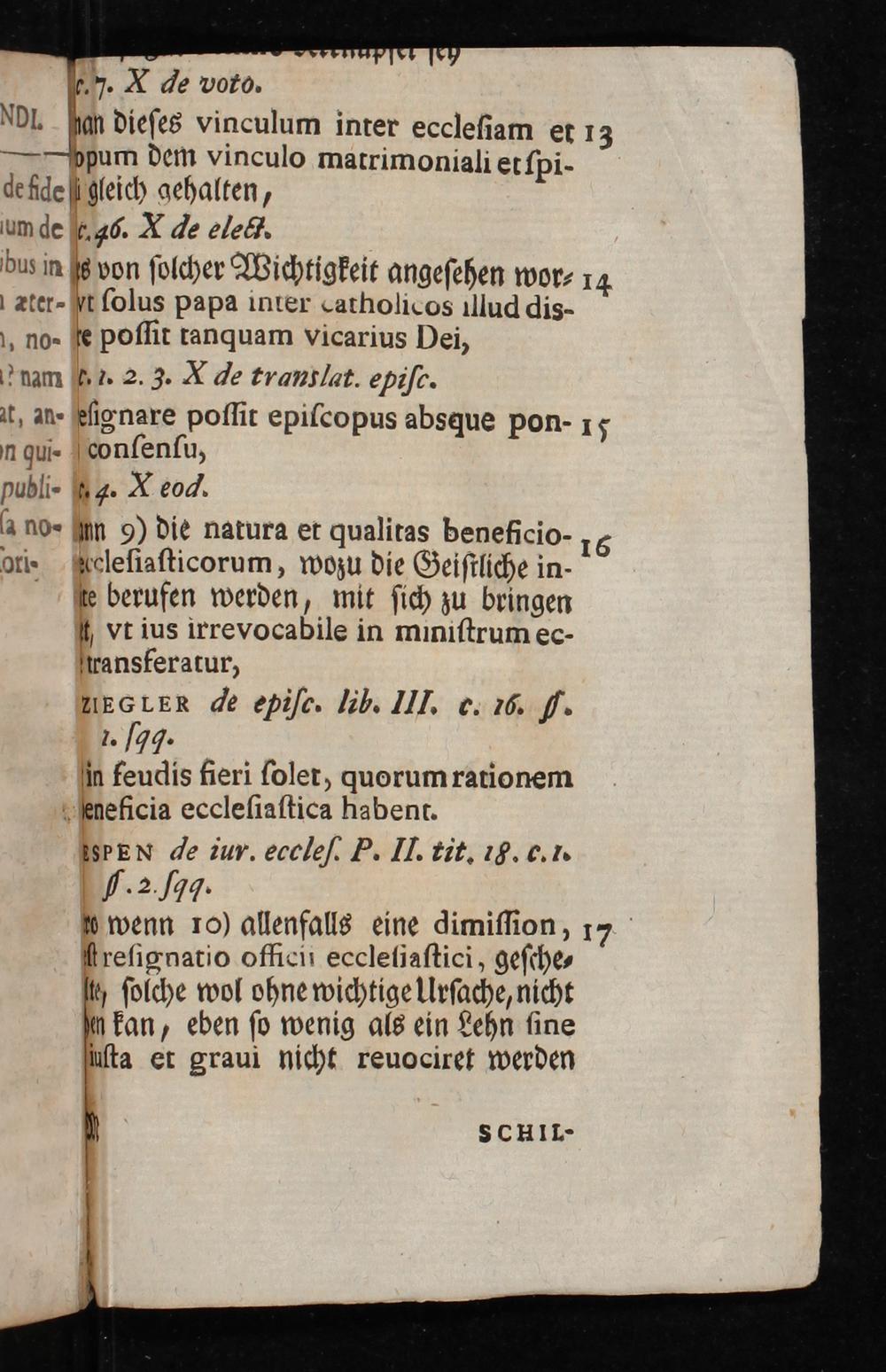 8PEN de iur. eccleſ. P. II. tit. 19. c. 1. FI. 2. 77. b wenn 10o) allenfalls eine dimiſſion, 17 ſreſignatio offici eccleſiaſtici, geſche⸗ t ſolche wol ohne wichtige Urſache, nicht in kan, eben ſo wenig als ein Lehn ſine ſta et graui nicht reuociret werden