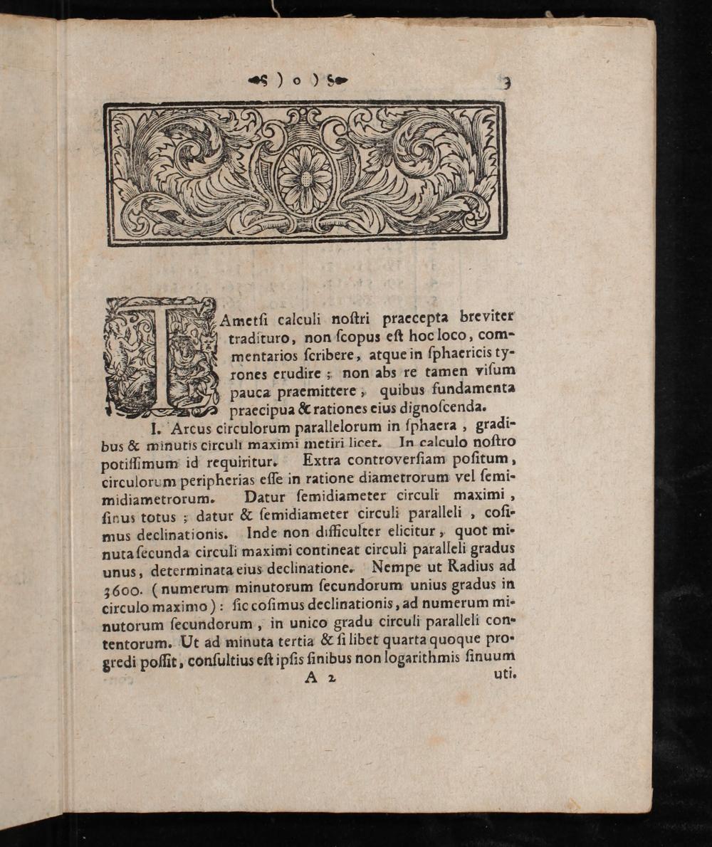 Ametſi calculi noſtri praccepta breviter 9 tradituro, non ſcopus eſt hoc loco, com- mentarios ſcribere, atque in ſphaericis ty- rones crudire; non abs re tamen viſum h pauca praemittere, quibus fundamenta — praecipua& rationes eius dignoſcenda. I. Arcus circulorum parallelorum in ſphaera, gradi- bus& minutis circuli maximi metiri licet. In calculo noſtro potiffimum id requiritur. Extra controverſiam poſitum, circulorum peripherias eſſe in ratione diametrorum vel ſemi- midiametrorum. Datur ſemidiameter circuli maximi, ſinus totus; datur& ſemidiameter circuli paralleli, cofi- mus declinationis. Inde non difficulter elicitur, quot mi- nuta ſecunda circuli maximi contineat circuli paralleli gradus unus, determinata eius declinatione. Nempe ut Kadius ad 3600.(numerum minutorum ſecundorum unius gradus in circulo maximo): ſic coſimus declinationis, ad numerum mi- nutorum ſecundorum, in unico gradu circuli paralleli con- tentorum. Ut ad minuta tertia& ſi libet quarta quoque pro- gredi poſſit, conſultius eſt ipſis ſinibus non logarithmis ſinuum A 2 uti.