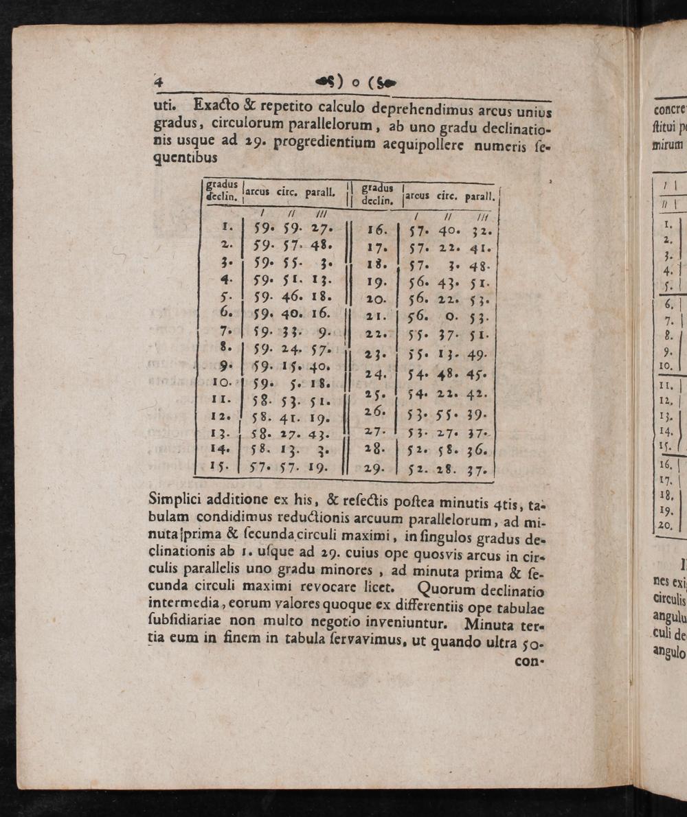 Simplici additione ex his,& reſectis poſtea minutis 4tis, ta⸗ bulam condidimus reductionis arcuum parallelorum, ad mi- nuta iprima& ſecunda circuli maximi, in ſingulos gradus de- clinationis ab 1. uſque ad 29. cuius ope quosvis arcus in cir- culis parallelis uno gradu minores, ad minuta prima& ſe- cunda circuli maximi revocare licet. Quorum declinatio intermedia, eorum valores quoque ex differentiis ope tabulae ſubſidiariae non multo negotio inveniuntur. Minuta ter- tia eum in finem in tabula ſervavimus, ut quando ultra 50-