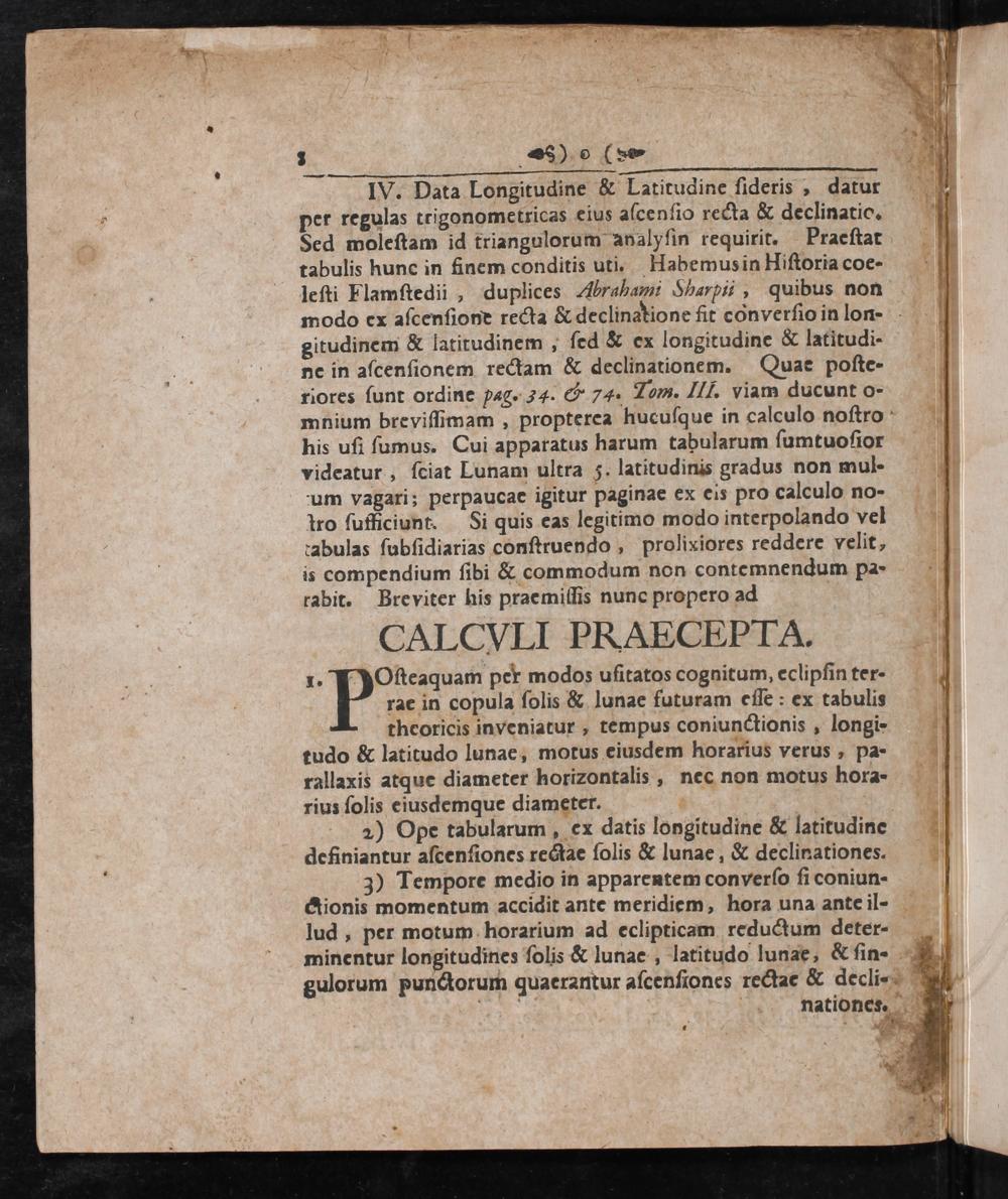 IWV. Data Longitudine& Latitudine ſideris, datur per regulas trigonometricas eius aſcenſio recta& declinatio. Sed moleſtam id triangulorum analyſin requirit. Praeſtat tabulis hunc in finem conditis uti. Habemus in Hiſtoria coe- leſti Flamſtedii, duplices Abrahami Sharpi, quibus non modo ex aſcenſiont recta& declinatione fit converſio in lon- gitudinem& latitudinem, ſed& ex longitudine& latitudi- ne in aſcenſionem rectam& declinationem. Quae poſte- riores ſunt ordine pag. 54. G& 74. Tom. Il. viam ducunt o- mnium breviſſimam, propterea hucuſque in calculo noſtro his ufi ſumus. Cui apparatus harum tabularum ſumtuoſior videatur, ſciat Lunam ultra 5. latitudinis gradus non mul- um vagari; perpaucae igitur paginae ex eis pro calculo no- tro ſufficiunt. Si quis eas legitimo modo interpolando vel rabulas ſubſidiarias conſtruendo, prolixiores reddere velit, is compendium ſibi& commodum non contemnendum pa- rabit. Breviter his praemifſis nunc propero ad
