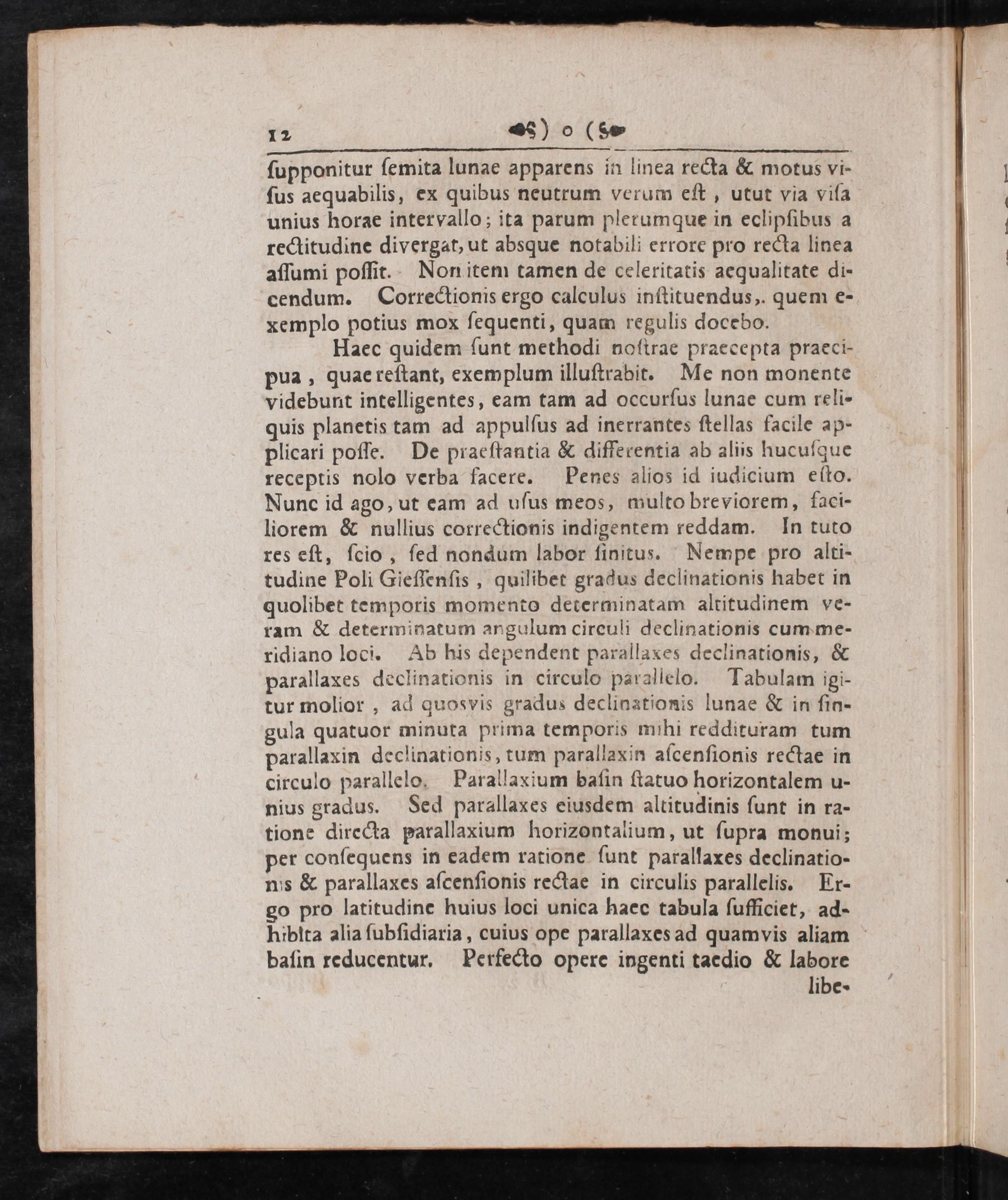 ſupponitur ſemita lunae apparens in linea recta& motus vi- ſus aequabilis, ex quibus neutrum verum eſt, utut via viſa unius horae intervallo; ita parum plerumque in eclipſibus a rectitudine divergat, ut absque notabili errore pro recta linea aſſumi poſſit. Non item tamen de celeritatis aequalitate di- cendum. Correctionis ergo calculus inſtituendus, quem e- xemplo potius mox ſequenti, quam regulis docebo.
