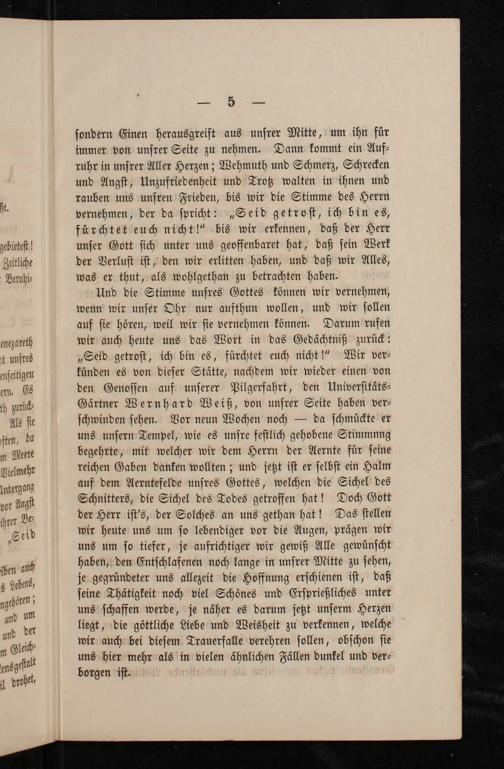 Und die Stimme unſres Gottes können wir vernehmen, wenn wir unſer Ohr nur aufthun wollen, und wir ſollen auf ſie hören, weil wir ſie vernehmen können. Darum rufen wir auch heute uns das Wort in das Gedächtniß zurück: „Seid getroſt, ich bin es, fürchtet euch nicht!“ Wir ver⸗ künden es von dieſer Stätte, nachdem wir wieder einen von den Genoſſen auf unſerer Pilgerfahrt, den Univerſitäts⸗ Gärtner Wernhard Weiß, von unſrer Seite haben ver⸗ ſchwinden ſehen. Vor neun Wochen noch— da ſchmückte er uns unſern Tempel, wie es unſre feſtlich gehobene Stimmung begehrte, mit welcher wir dem Herrn der Aernte für ſeine reichen Gaben danken wollten; und jetzt iſt er ſelbſt ein Halm auf dem Aerntefelde unſres Gottes, welchen die Sichel des Schnitters, die Sichel des Todes getroffen hat! Doch Gott der Herr iſt's, der Solches an uns gethan hat! Das ſtellen wir heute uns um ſo lebendiger vor die Augen, prägen wir uns um ſo tiefer, je aufrichtiger wir gewiß Alle gewünſcht haben, den Entſchlafenen noch lange in unſrer Mitte zu ſehen, je gegründeter uns allezeit die Hoffnung erſchienen iſt, daß ſeine Thätigkeit noch viel Schönes und Erſprießliches unter uns ſchaffen werde, je näher es darum jetzt unſerm Herzen liegt, die göttliche Liebe und Weisheit zu verkennen, welche wir auch bei dieſem Trauerfalle verehren ſollen, obſchon ſie uns hier mehr als in vielen ähnlichen Fällen dunkel und ver⸗ borgen iſt.