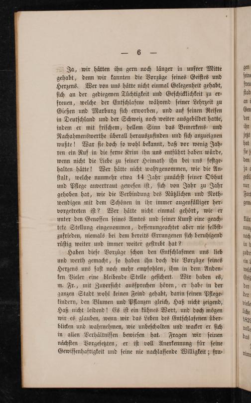 Ja, wir hätten ihn gern noch länger in unſrer Mitte gehabt, denn wir kannten die Vorzüge ſeines Geiſtes und Herzens. Wer von uns hätte nicht einmal Gelegenheit gehabt, ſich an der gediegenen Tüchtigkeit und Geſchicklichkeit zu er⸗ freuen, welche der Entſchlafene während ſeiner Lehrzeit zu Gießen und Marburg ſich erworben, und auf ſeinen Reiſen in Deutſchland und der Schweiz noch weiter ausgebildet hatte, indem er mit friſchem, hellem Sinn das Bemerkens⸗ und Nachahmenswerthe überall herauszufinden und ſich anzueignen wußte! War ſie doch ſo wohl bekannt, daß vor wenig Jah⸗ ren ein Ruf in die ferne Krim ihn uns entführt haben würde, wenn nicht die Liebe zu ſeiner Heimath ihn bei uns feſtge⸗ halten hätte! Wer hätte nicht wahrgenommen, wie die An⸗ ſtalt, welche nunmehr etwa 14 Jahr zunächſt ſeiner Obhut und Pflege anvertraut geweſen iſt, ſich von Jahr zu Jahr gehoben hat, wie die Verbindung des Nützlichen und Noth⸗ wendigen mit dem Schönen in ihr immer augenfälliger her⸗ vorgetreten iſt? Wer hätte nicht einmal gehört, wie er unter den Genoſſen ſeines Amtes und ſeiner Kunſt eine geach⸗ tete Stellung eingenommen, deſſenungeachtet aber nie ſelbſt⸗ zufrieden, niemals bei dem bereits Errungenen ſich beruhigend rüſtig weiter und immer weiter geſtrebt hat?