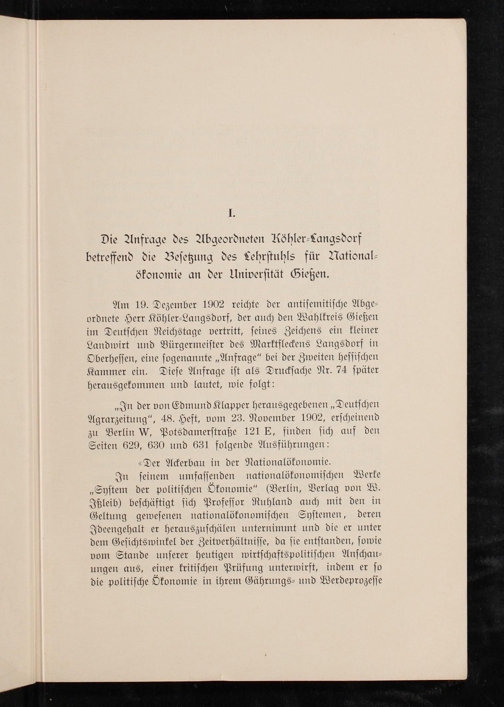 „In der von Edmund Klapper herausgegebenen„Deutſchen Agrarzeitung“, 48. Heft, vom 23. November 1902, erſcheinend zu Berlin W, Potsdamerſtraße 121 E, finden ſich auf den Seiten 629, 630 und 631 folgende Ausführungen: