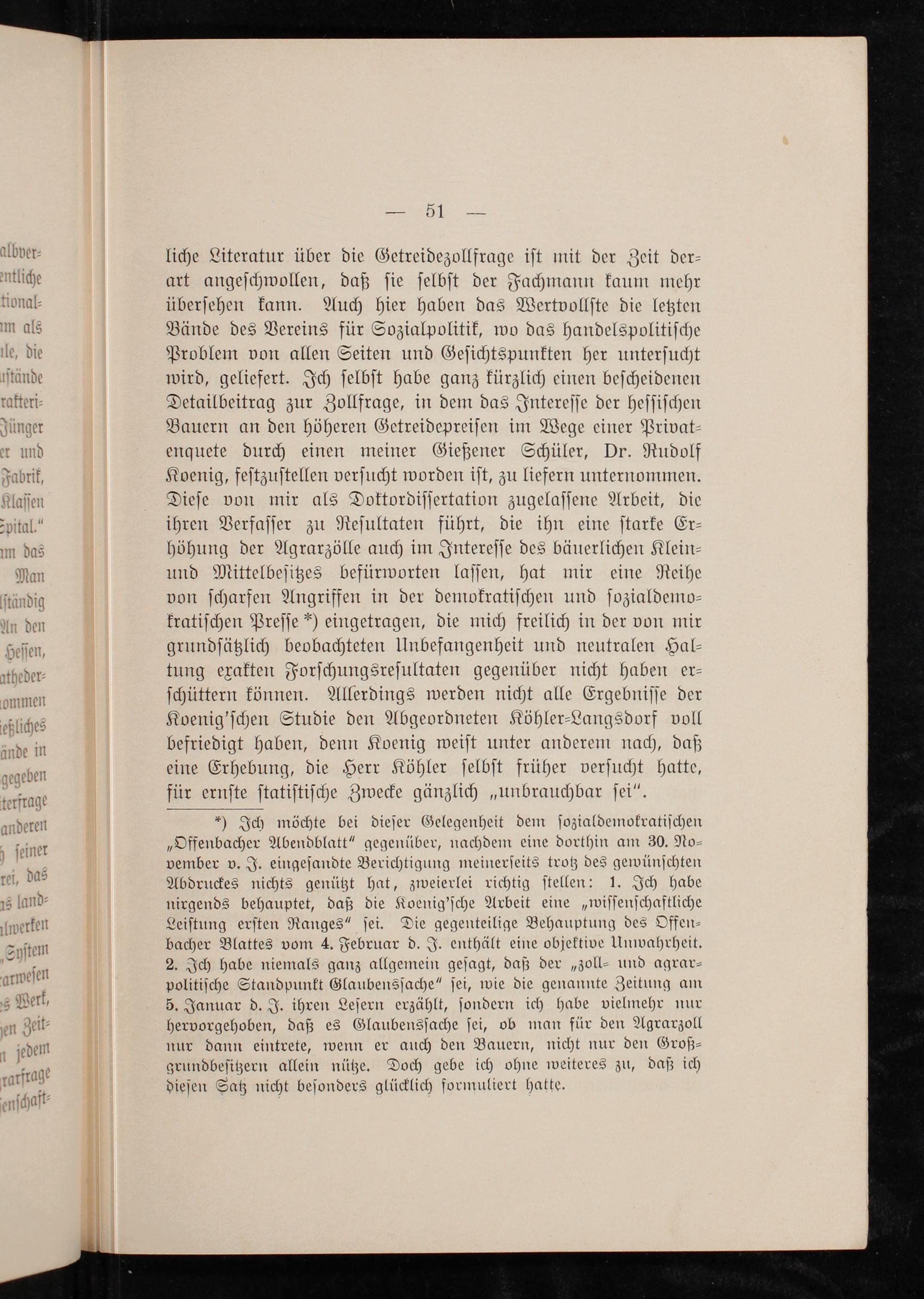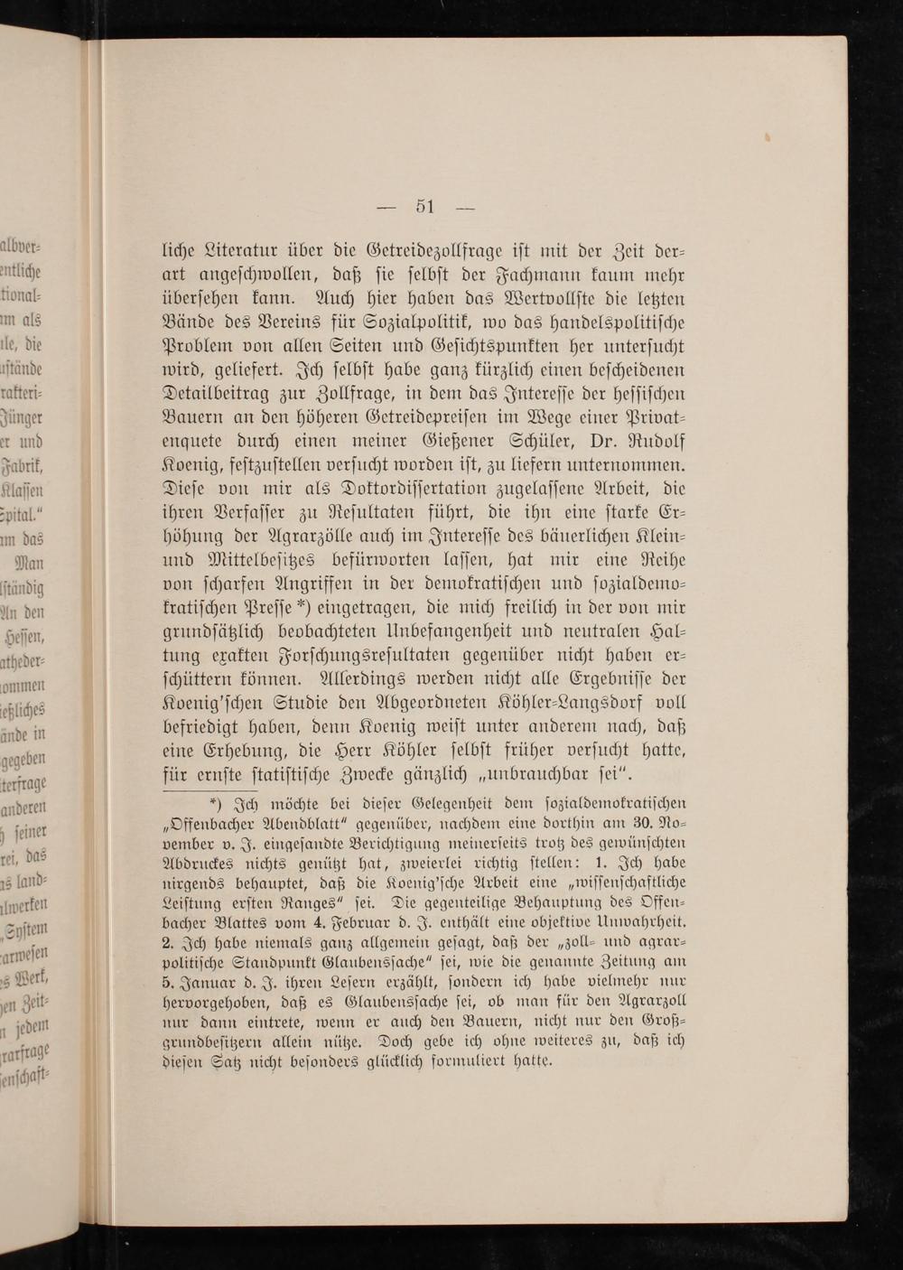 liche Literatur über die Getreidezollfrage iſt mit der Zeit der⸗ art angeſchwollen, daß ſie ſelbſt der Fachmann kaum mehr überſehen kann. Auch hier haben das Wertvollſte die letzten Bände des Vereins für Sozialpolitik, wo das handelspolitiſche Problem von allen Seiten und Geſichtspunkten her unterſucht wird, geliefert. Ich ſelbſt habe ganz kürzlich einen beſcheidenen Detailbeitrag zur Zollfrage, in dem das Intereſſe der heſſiſchen Bauern an den höheren Getreidepreiſen im Wege einer Privat⸗ enquete durch einen meiner Gießener Schüler, Dr. Rudolf Koenig, feſtzuſtellen verſucht worden iſt, zu liefern unternommen. Dieſe von mir als Doktordiſſertation zugelaſſene Arbeit, die ihren Verfaſſer zu Reſultaten führt, die ihn eine ſtarke Er— höhung der Agrarzölle auch im Intereſſe des bäuerlichen Klein— und Mittelbeſitzes befürworten laſſen, hat mir eine Reihe von ſcharfen Angriffen in der demokratiſchen und ſozialdemo⸗ kratiſchen Preſſe*) eingetragen, die mich freilich in der von mir grundſätzlich beobachteten Unbefangenheit und neutralen Hal⸗ tung exakten Forſchungsreſultaten gegenüber nicht haben er⸗ ſchüttern können. Allerdings werden nicht alle Ergebniſſe der Koenig'ſchen Studie den Abgeordneten Köhler⸗Langsdorf voll befriedigt haben, denn Koenig weiſt unter anderem nach, daß eine Erhebung, die Herr Köhler ſelbſt früher verſucht hatte für ernſte ſtatiſtiſche Zwecke gänzlich„unbrauchbar ſei“.