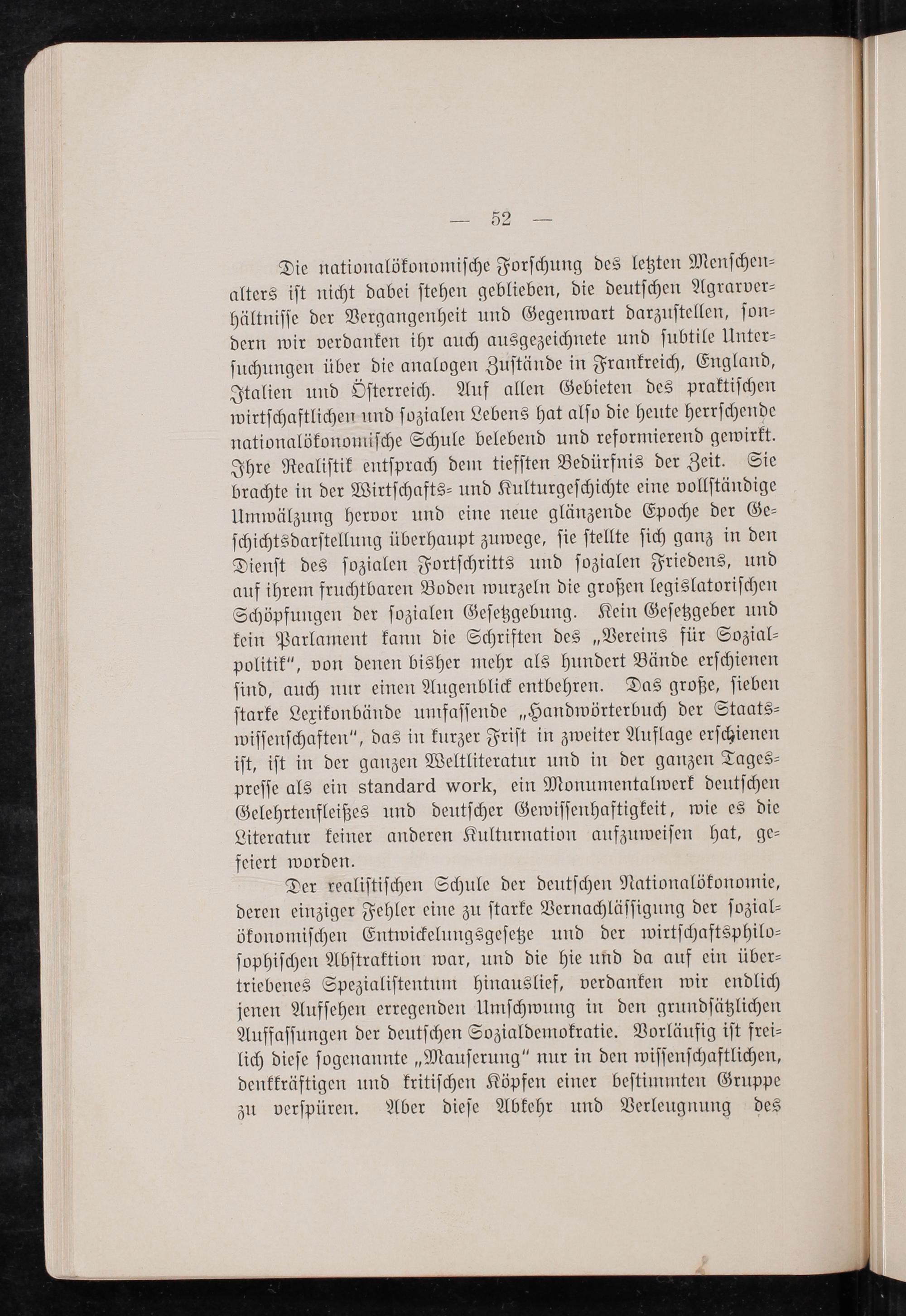 Die nationalökonomiſche Forſchung des letzten Menſchen⸗ alters iſt nicht dabei ſtehen geblieben, die deutſchen Agrarver⸗ hältniſſe der Vergangenheit und Gegenwart darzuſtellen, ſon⸗ dern wir verdanken ihr auch ausgezeichnete und ſubtile Unter— ſuchungen über die analogen Zuſtände in Frankreich, England, Italien und ſterreich. Auf allen Gebieten des praktiſchen wirtſchaftlichen und ſozialen Lebens hat alſo die heute herrſchende nationalökonomiſche Schule belebend und reformierend gewirkt. Ihre Realiſtik entſprach dem tiefſten Bedürfnis der Zeit. Sie brachte in der Wirtſchafts⸗ und Kulturgeſchichte eine vollſtändige Umwälzung hervor und eine neue glänzende Epoche der Ge⸗ ſchichtsdarſtellung überhaupt zuwege, ſie ſtellte ſich ganz in den Dienſt des ſozialen Fortſchritts und ſozialen Friedens, und auf ihrem fruchtbaren Boden wurzeln die großen legislatoriſchen Schöpfungen der ſozialen Geſetzgebung. Kein Geſetzgeber und kein Parlament kann die Schriften des„Vereins für Sozial⸗ politik“, von denen bisher mehr als hundert Bände erſchienen ſind, auch nur einen Augenblick entbehren. Das große, ſieben ſtarke Lexikonbände umfaſſende„Handwörterbuch der Staats⸗ wiſſenſchaften“, das in kurzer Friſt in zweiter Auflage erſchienen iſt, iſt in der ganzen Weltliteratur und in der ganzen Tages⸗ preſſe als ein standard work, ein Monumentalwerk deutſchen Gelehrtenfleißes und deutſcher Gewiſſenhaftigkeit, wie es die Literatur keiner anderen Kulturnation aufzuweiſen hat, ge⸗ feiert worden.