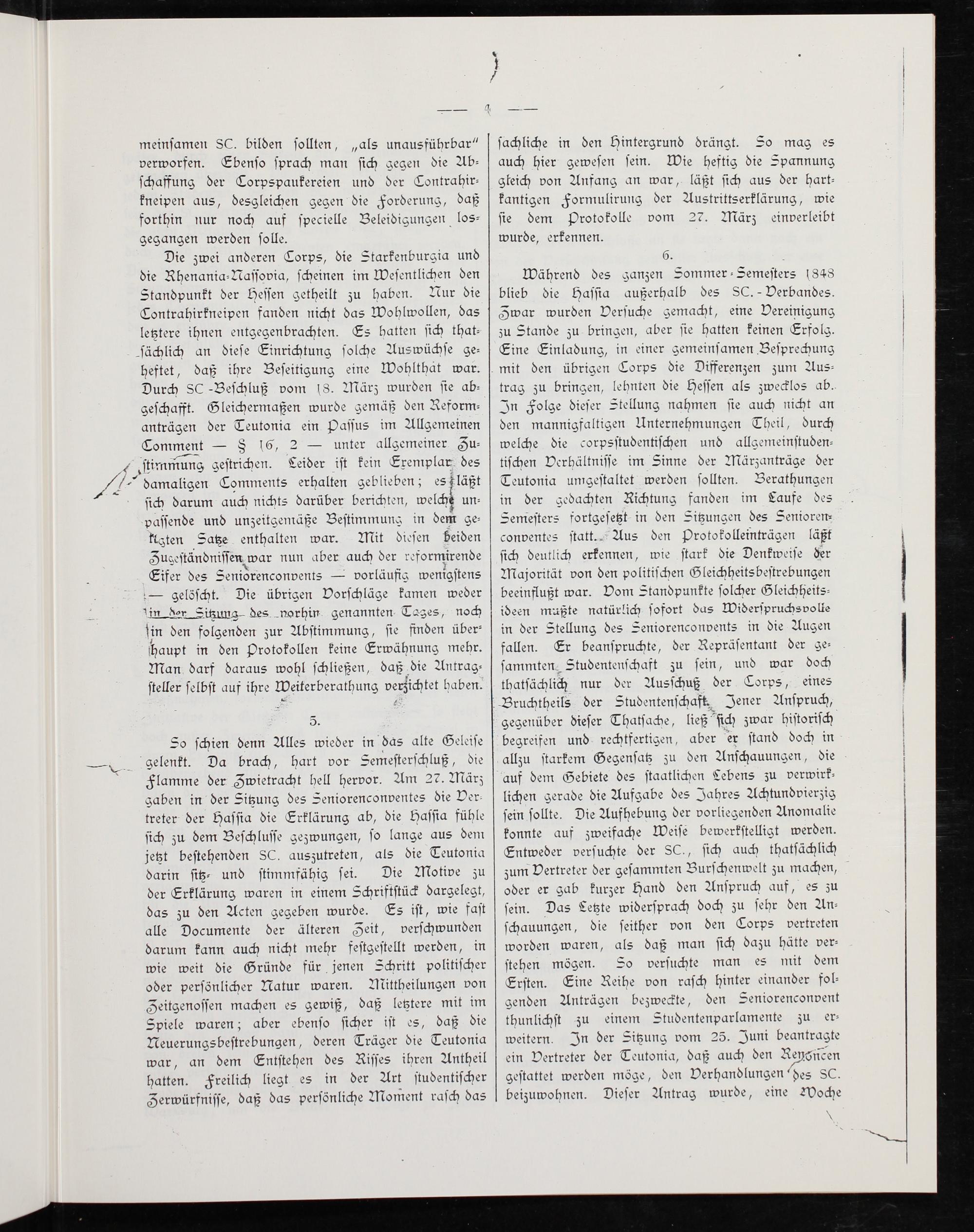 Während des Janzen Sommer⸗Semeſters 1[848 blieb die Haſſia außerhalb des SC.-Verbandes. Zwar wurden Verſuche gemacht, eine Vereinigung zu Stande zu bringen, aber ſie hatten keinen Erfols. Sine Einladung, in einer gemeinſamen Beſprechung mit den übrigen Corps die Differenzen zum Aus⸗ trag zu bringen, lehnten die Heſſen als zwecklos ab. In Folge dieſer Stellung nahmen ſie auch nicht an den mannigfaltigen Unternehmungen Theil, durch welche die corpsſtudentiſchen und allgemeinſtuden⸗ tiſchen Verhältniſſe im Sinne der Märzanträge der Teutonia umgeſtaltet werden ſollten. Berathungen in der gedachten Richtung fanden im Laufe des Semeſters fortgeſetzt in den Sitzungen des Senioren⸗ conventes ſtatt. Aus den Protokolleinträgen läßt ſich deutlich erkennen, wie ſtark die Denkweiſe der Majorität von den politiſchen Gleichheitsbeſtrebungen beeinflußt war. Vom Standpunkte ſolcher Gleichheits⸗ ideen mußte natürlich ſofort das Widerſpruchsvolle in der Stellung des Seniorenconvents in die Augen fallen. Er beanſpruchte, der Repräſentant der ge⸗ ſammten Studentenſchaft zu ſein, und war doch thatſächlich nur der Ausſchuß der Corps, eines