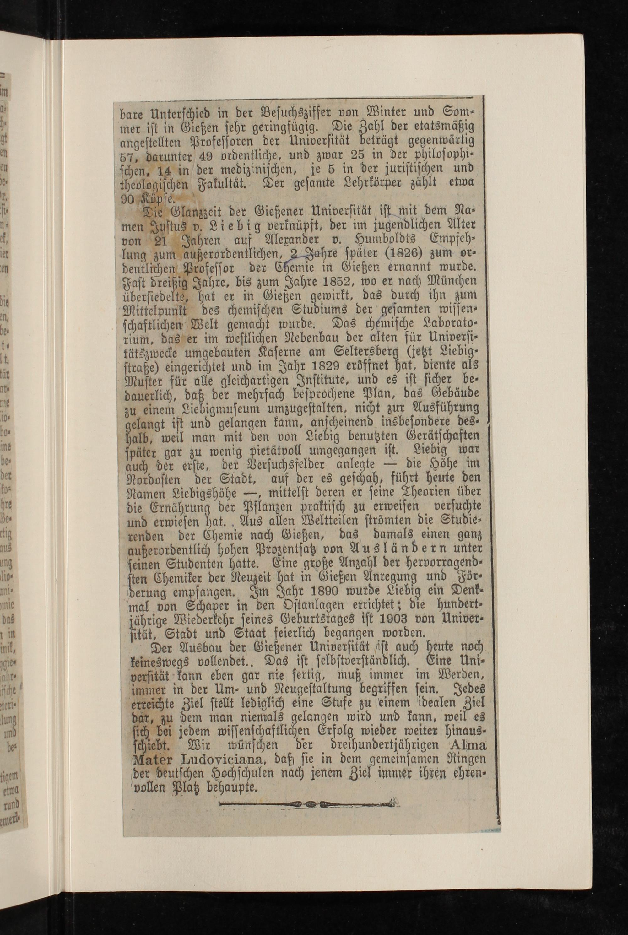 . fer v. Liebig verknüpft, der im jugendlichen Alter von 2 ahren auf Alexander v. Humboldts Empfeh⸗ lung zum außerordentlichen, 2— Jahre ſpäter(1826) zum or⸗ dentlichen Profeſſor der Chemie in Gießen ernannt wurde. Faſt drei is Jahre, bis zum Jahre 1852, wo er nach München überſiedelte, hat er in Gießen gewirkt, das durch ihn zum Mittelpunkt des chemiſchen Studiums der geſamten wiſſen⸗ ſchaftlichen Welt gemacht wurde. Das chemiſche Laborato⸗ rium, das er im weſtlichen Nebenbau der alten für Univerſi⸗ tätszwecke umgebauten Kaſerne am Seltersberg(jetzt tielih⸗ ſtraße) eingerichtet und im Jahr 1829 eröffnet hat, diente als Muſter für alle gleichartigen Inſtitute, und es iſt ſicher be⸗ dauerlich, daß der mehrfach beſprochene Plan, das Gebäude zu einem Liebigmuſeum umzugeſtalten, nicht zur Ausführung elangt iſt und gelangen kann, anſcheinend insbeſondere des⸗ halb, weil man mit den von Liebig benutzten Gerätſchaften ſpüäter gar zu wenig pietätvoll umgegangen iſt. Liebig war auch der erſte, der Verſuchsfelder anlegte— die Höhe im Nordoſten der Stadt, auf der es geſchah, führt heute den Namen Liebigshöhe—, mittelſt deren er ſeine Theorien über die Ernährung der Pflanzen praktiſch zu erweiſen verſuchte und erwieſen hat. Aus allen Weltteilen ſtrömten die Studie⸗ renden der Chemie nach Gießen, das damals einen ganz außerordentlich hohen Prozentſatz von Au sländern unter ſeinen Studenten hatte. Eine große Anzahl der hervorragend⸗ ten Chemiker der Neuzeit hat in Gießen Anregung und För⸗ derung empfangen. Im Jahr 1890 wurde Liebig ein Denk⸗ mal von Schaper in den Oſtanlagen errichtet; die hundert⸗ jährige Wiederkehr ſeines Geburtstages iſt 1903 von Univer⸗ ſität, Stadt und Staat feierlich begangen worden.