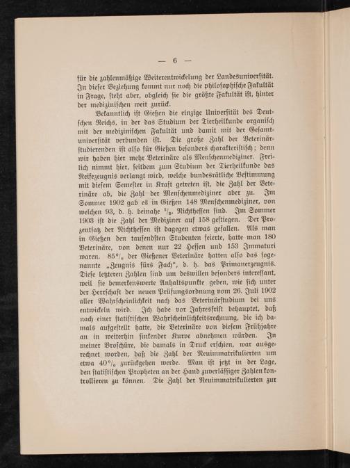 Bekanntlich iſt Gießen die einzige Univerſität des Deut⸗ ſchen Reichs, in der das Studium der Tierheilkunde organiſch mit der mediziniſchen Fakultät und damit mit der Geſamt⸗ univerſität verbunden iſt. Die große Zahl der Veterinär⸗ ſtudierenden iſt alſo für Gießen beſonders charakteriſtiſch; denn wir haben hier mehr Veterinäre als Menſchenmediziner. Frei⸗ lich nimmt hier, ſeitdem zum Studium der Tierheilkunde das Reifezeugnis verlangt wird, welche bundesrätliche Beſtimmung mit dieſem Semeſter in Kraft getreten iſt, die Zahl der Vete⸗ rinäre ab, die Zahl der Menſchenmediziner aber zu. Im Sommer 1902 gab es in Gießen 148 Menſchenmediziner, von welchen 93, d. h. beinahe, Nichtheſſen ſind. Im Sommer 1903 iſt die Zahl der Mediziner auf 158 geſtiegen. Der Pro⸗ zentſatz der Nichtheſſen iſt dagegen etwas gefallen. Als man in Gießen den tauſendſten Studenten feierte, hatte man 180 Veterinäre, von denen nur 22 Heſſen und 153 Immaturi waren. 85% der Gießener Veterinäre hatten alſo das ſoge⸗ nannte„Zeugnis fürs Fach“, d. h. das Primanerzeugnis. Dieſe letzteren Zahlen ſind um deswillen beſonders intereſſant, weil ſie bemerkenswerte Anhaltspunkte geben, wie ſich unter der Herrſchaft der neuen Prüfungsordnung vom 26. Juli 1902 aller Wahrſcheinlichkeit nach das Veterinärſtudium bei uns entwickeln wird. Ich habe vor Jahresfriſt behauptet, daß nach einer ſtatiſtiſchen Wahrſcheinlichkeitsrechnung, die ich da⸗ mals aufgeſtellt hatte, die Veterinäre von dieſem Frühjahre an in weiterhin ſinkender Kurve abnehmen würden. In meiner Broſchüre, die damals in Druck erſchien, war ausge⸗ rechnet worden, daß die Zahl der Neuimmatrikulierten um etwa 40% zurückgehen werde. Man iſt jetzt in der Lage, den ſtatiſtiſchen Propheten an der Hand zuverläſſiger Zahlen kon⸗ trollieren zu können. Die Zahl der Neuimmatrikulierten zur