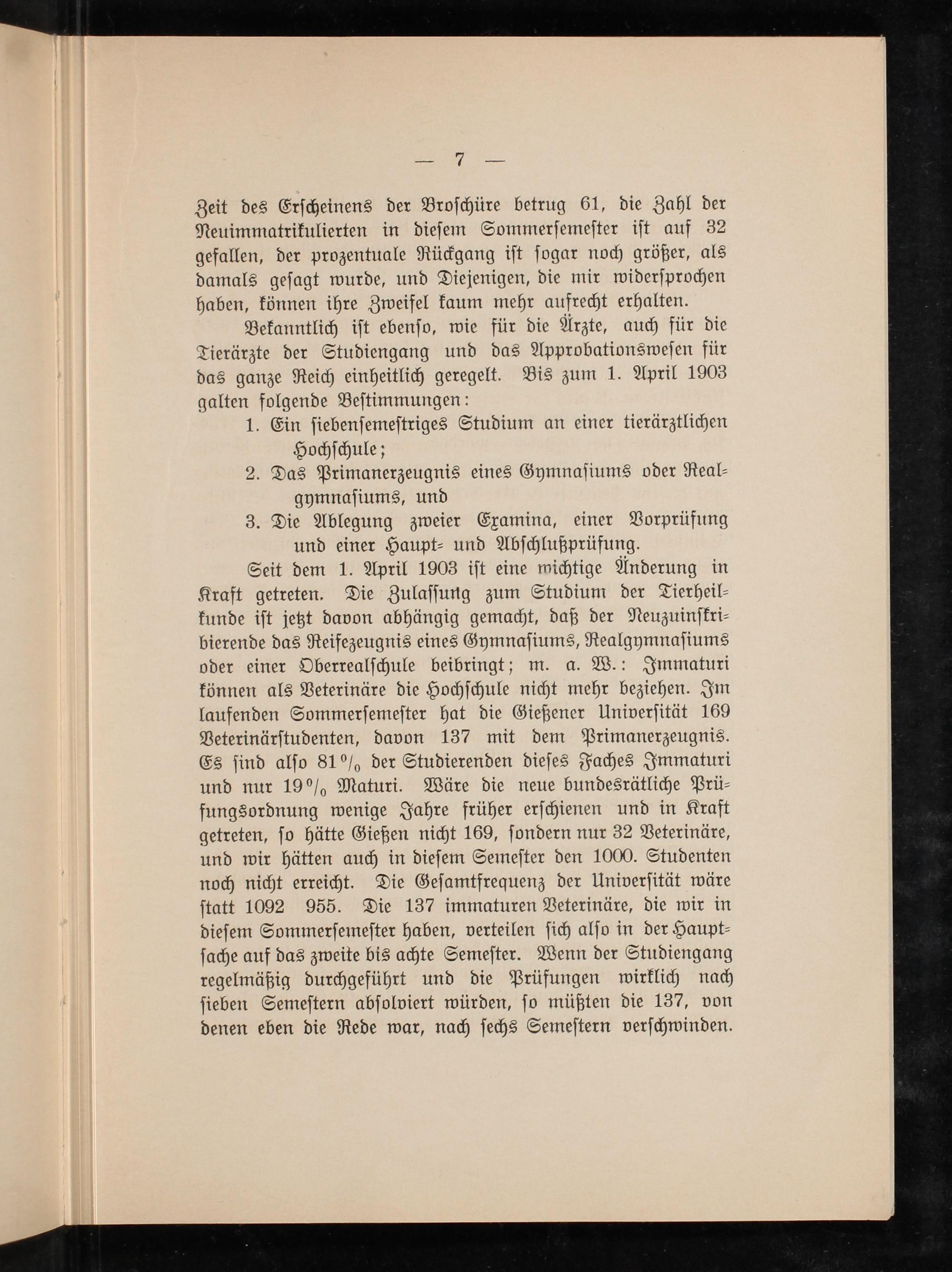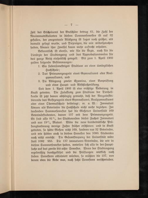 Seit dem 1. April 1903 iſt eine wichtige Änderung in Kraft getreten. Die Zulaſſung zum Studium der Tierheil⸗ kunde iſt jetzt davon abhängig gemacht, daß der Neuzuinſkri⸗ bierende das Reifezeugnis eines Gymnaſiums, Realgymnaſiums oder einer Oberrealſchule beibringt; m. a. W.: Immaturi können als Veterinäre die Hochſchule nicht mehr beziehen. Im laufenden Sommerſemeſter hat die Gießener Univerſität 169 Veterinärſtudenten, davon 137 mit dem Primanerzeugnis. Es ſind alſo 81% der Studierenden dieſes Faches Immaturi und nur 19% Maturi. Wäre die neue bundesrätliche Prü⸗ fungsordnung wenige Jahre früher erſchienen und in Kraft getreten, ſo hätte Gießen nicht 169, ſondern nur 32 Veterinäre, und wir hätten auch in dieſem Semeſter den 1000. Studenten noch nicht erreicht. Die Geſamtfrequenz der Univerſität wäre ſtatt 1092 955. Die 137 immaturen Veterinäre, die wir in dieſem Sommerſemeſter haben, verteilen ſich alſo in der Haupt⸗ ſache auf das zweite bis achte Semeſter. Wenn der Studiengang regelmäßig durchgeführt und die Prüfungen wirklich nach ſieben Semeſtern abſolviert würden, ſo müßten die 137, von denen eben die Rede war, nach ſechs Semeſtern verſchwinden.