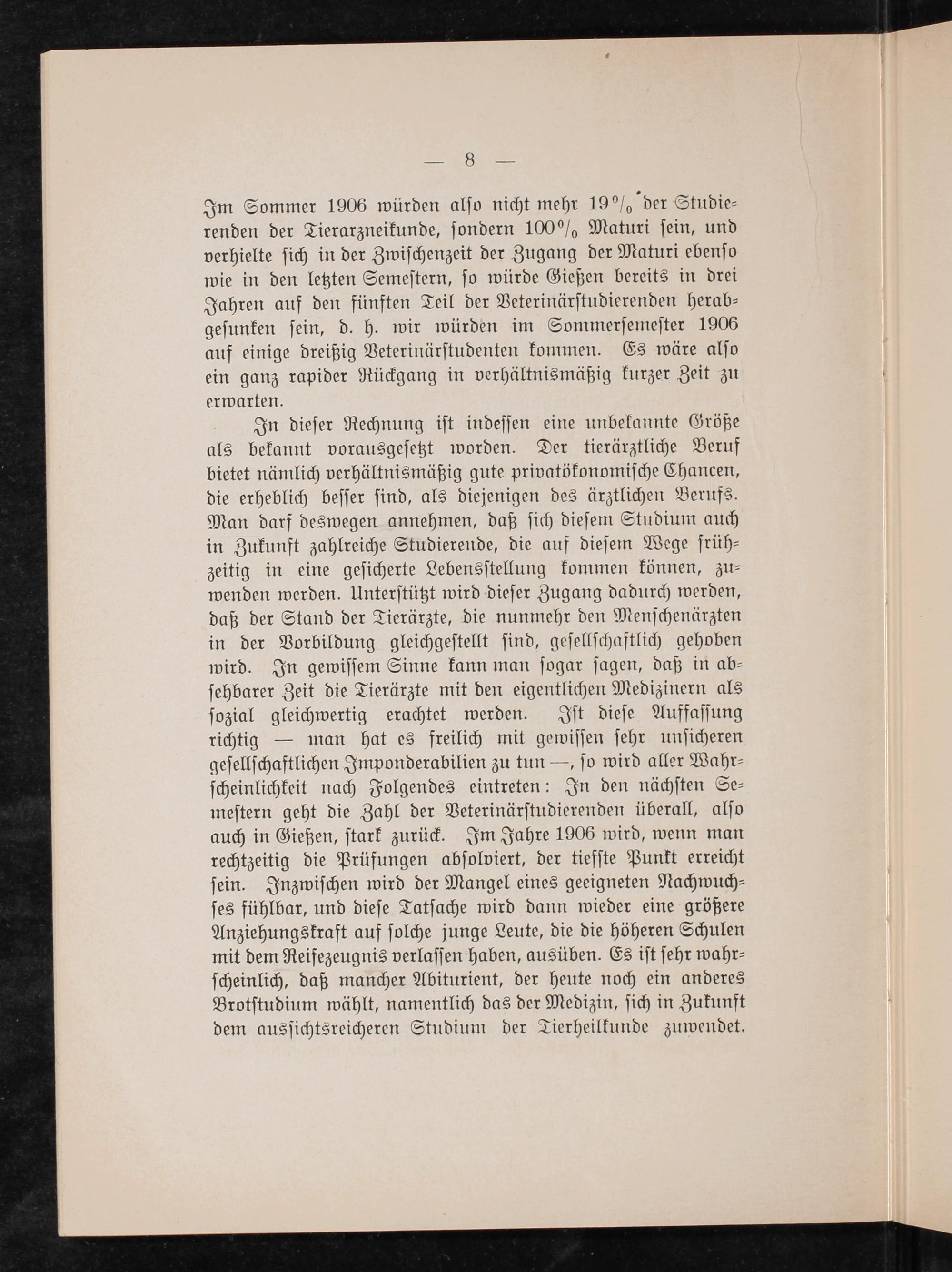 In dieſer Rechnung iſt indeſſen eine unbekannte Größe als bekannt vorausgeſetzt worden. Der tierärztliche Beruf bietet nämlich verhältnismäßig gute privatökonomiſche Chancen, die erheblich beſſer ſind, als diejenigen des ärztlichen Berufs. Man darf deswegen annehmen, daß ſich dieſem Studium auch in Zukunft zahlreiche Studierende, die auf dieſem Wege früh⸗ zeitig in eine geſicherte Lebensſtellung kommen können, zu⸗ wenden werden. Unterſtützt wird dieſer Zugang dadurch werden, daß der Stand der Tierärzte, die nunmehr den Menſchenärzten in der Vorbildung gleichgeſtellt ſind, geſellſchaftlich gehoben wird. In gewiſſem Sinne kann man ſogar ſagen, daß in ab— ſehbarer Zeit die Tierärzte mit den eigentlichen Medizinern als ſozial gleichwertig erachtet werden. Iſt dieſe Auffaſſung richtig— man hat es freilich mit gewiſſen ſehr unſicheren geſellſchaftlichen Imponderabilien zu tun—, ſo wird aller Wahr⸗ ſcheinlichkeit nach Folgendes eintreten: In den nächſten Se⸗ meſtern geht die Zahl der Veterinärſtudierenden überall, alſo auch in Gießen, ſtark zurück. Im Jahre 1906 wird, wenn man rechtzeitig die Prüfungen abſolviert, der tiefſte Punkt erreicht ſein. Inzwiſchen wird der Mangel eines geeigneten Nachwuch⸗ ſes fühlbar, und dieſe Tatſache wird dann wieder eine größere Anziehungskraft auf ſolche junge Leute, die die höheren Schulen mit dem Reifezeugnis verlaſſen haben, ausüben. Es iſt ſehr wahr⸗ ſcheinlich, daß mancher Abiturient, der heute noch ein anderes Brotſtudium wählt, namentlich das der Medizin, ſich in Zukunft dem ausſichtsreicheren Studium der Tierheilkunde zuwendet.