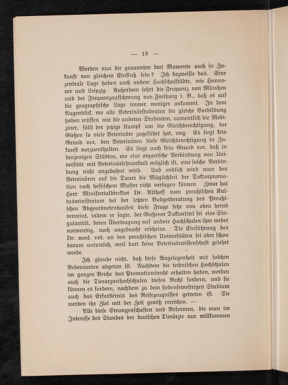 Werden nun die genannten drei Momente auch in Zu⸗ kunft von gleichem Einfluß ſein? Ich bezweifle das. Eine zentrale Lage haben auch andere Hochſchulſtädte, wie Hanno⸗ ver und Leipzig. Außerdem lehrt die Frequenz von München und der Frequenzaufſchwung von Freiburg i. B., daß es auf die geographiſche Lage immer weniger ankommt. In dem Augenblick, wo alle Veterinärſtudenten die gleiche Vorbildung haben müſſen wie die anderen Studenten, namentlich die Medi⸗ ziner, fällt der jetzige Kampf um die Gleichberechtigung, der Gießen ſo viele Veterinäre zugeführt hat, weg. Es liegt kein Grund vor, den Veterinären dieſe Gleichberechtigung in Zu⸗ kunft vorzuenthalten. Es liegt auch kein Grund vor, daß in denjenigen Städten, wo eine organiſche Verbindung von Uni⸗ verſität mit Veterinärlehranſtalt möglich iſt, eine ſolche Verbin⸗ dung nicht angebahnt wird. Und endlich wird man den Veterinären auf die Dauer die Möglichkeit der Doktorpromo⸗ tion nach heſſiſchem Muſter nicht verſagen können. Zwar hat Herr Miniſterialdirektor Dr. Althoff vom preußiſchen Kul⸗ tusminiſterium bei der letzten Budgetberatung des Preußi⸗ ſchen Abgeordnetenhauſes dieſe Frage ſehr von oben herab verneint, indem er ſagte, der Gießener Doktortitel ſei eine Sin⸗ gularität, deren übertragung auf andere Hochſchulen ihm weder notwendig, noch angebracht erſcheine. Die Einführung des Dr. med. vet. an den preußiſchen Univerſitäten ſei aber ſchon darum untunlich, weil dort keine Veterinärwiſſenſchaft gelehrt werde.—