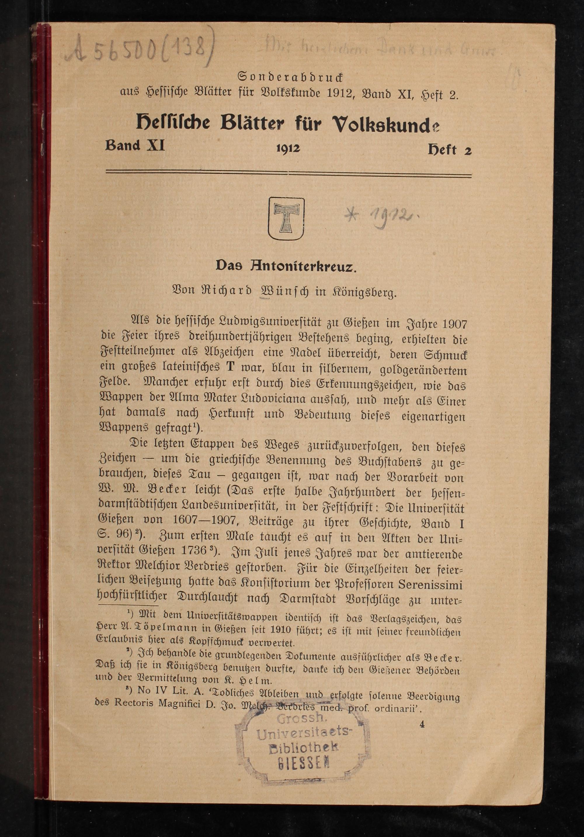 Sonderabdruck aus Heſſiſche Blätter für Volkskunde 1912, Band XlI, Heft 2.
