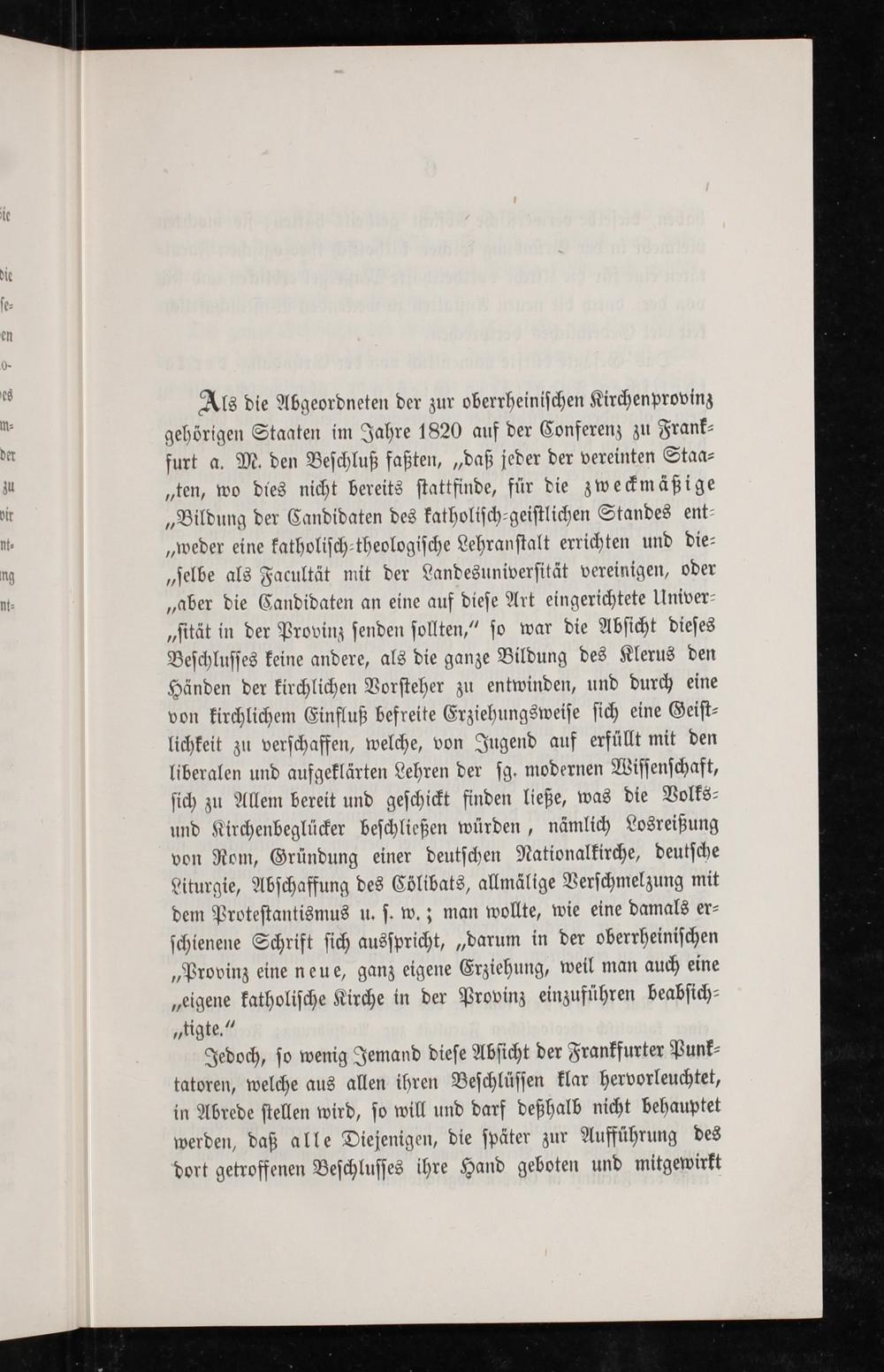 Als die Abgeordneten der zur oberrheiniſchen Kirchenprovinz gehörigen Staaten im Jahre 1820 auf der Conferenz zu Frank⸗ furt a. M. den Beſchluß faßten,„daß jeder der vereinten Staa⸗ „ten, wo dies nicht bereits ſtattfinde, für die zweckmäßige „Bildung der Candidaten des katholiſch⸗geiſtlichen Standes ent⸗ „weder eine katholiſch⸗theologiſche Lehranſtalt errichten und die⸗ „ſelbe als Facultät mit der Landesuniverſität vereinigen, oder „aber die Candidaten an eine auf dieſe Art eingerichtete Univer⸗ „ſität in der Provinz ſenden ſollten,“ ſo war die Abſicht dieſes Beſchluſſes keine andere, als die ganze Bildung des Klerus den Händen der kirchlichen Vorſteher zu entwinden, und durch eine von kirchlichem Einfluß befreite Erziehungsweiſe ſich eine Geiſt⸗ lichkeit zu verſchaffen, welche, von Jugend auf erfüllt mit den liberalen und aufgeklärten Lehren der ſg. modernen Wiſſenſchaft, ſich zu Allem bereit und geſchickt finden ließe, was die Volks⸗ und Kirchenbeglücker beſchließen würden, nämlich Losreißung von Rom, Gründung einer deutſchen Nationalkirche, deutſche Liturgie, Abſchaffung des Cölibats, allmälige Verſchmelzung mit dem Proteſtantismus u. ſ. w.; man wollte, wie eine damals er⸗ ſchienene Schrift ſich ausſpricht,„darum in der oberrheiniſchen „Provinz eine neue, ganz eigene Erziehung, weil man auch eine „eigene katholiſche Kirche in der Provinz einzuführen beabſich⸗ „tigte.“