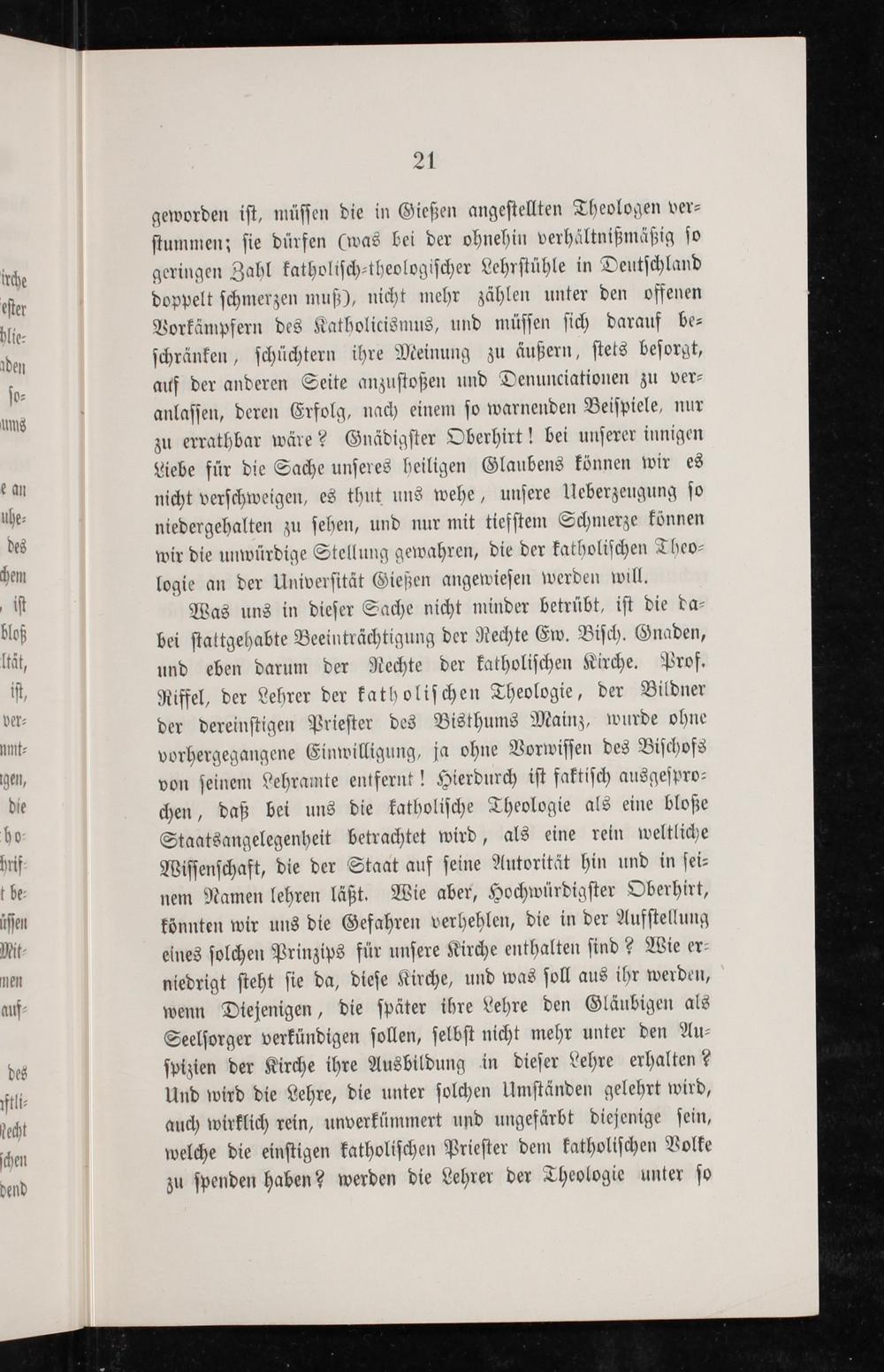 21 geworden iſt, müſſen die in Gießen angeſtellten Theologen ver⸗ ſtummen; ſie dürfen(was bei der ohnehin verhältnißmäßig ſo geringen Zahl katholiſch⸗theologiſcher Lehrſtühle in Deutſchland doppelt ſchmerzen muß), nicht mehr zählen unter den offenen Vorkämpfern des Katholicismus, und müſſen ſich darauf be⸗ ſchränken, ſchüchtern ihre Meinung zu äußern, ſtets beſorgt, auf der anderen Seite anzuſtoßen und Denunciationen zu ver⸗ anlaſſen, deren Erfolg, nach einem ſo warnenden Beiſpiele, nur zu errathbar wäre? Gnädigſter Oberhirt! bei unſerer innigen Liebe für die Sache unſeres heiligen Glaubens können wir es nicht verſchweigen, es thut uns wehe, unſere Ueberzeugung ſo niedergehalten zu ſehen, und nur mit tiefſtem Schmerze können wir die unwürdige Stellung gewahren, die der katholiſchen Theo⸗ logie an der Univerſität Gießen angewieſen werden will.
