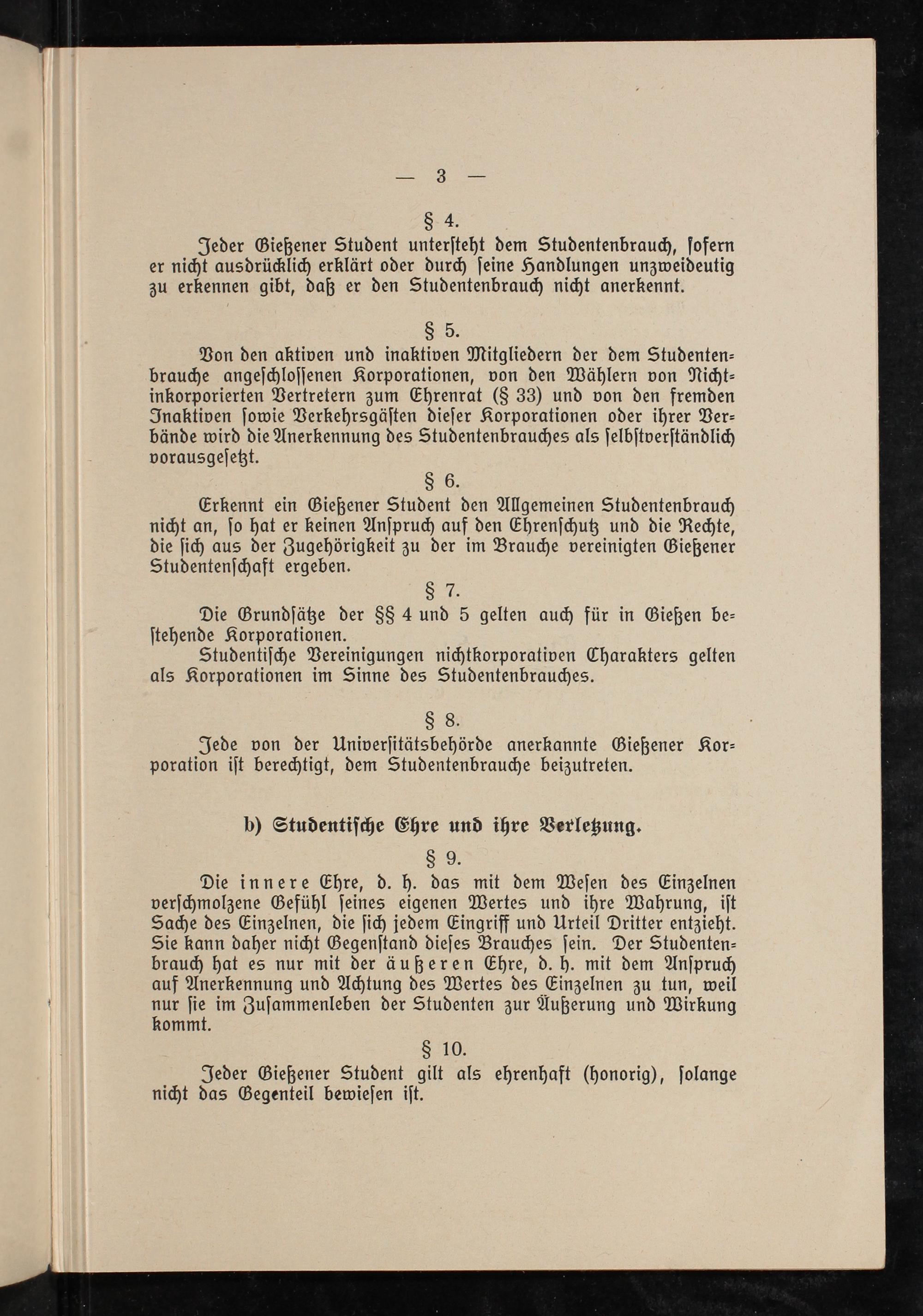 § 4. Jeder Gießener Student unterſteht dem Studentenbrauch, ſofern er nicht ausdrücklich erklärt oder durch ſeine Handlungen unzweideutig zu erkennen gibt, daß er den Studentenbrauch nicht anerkennt.