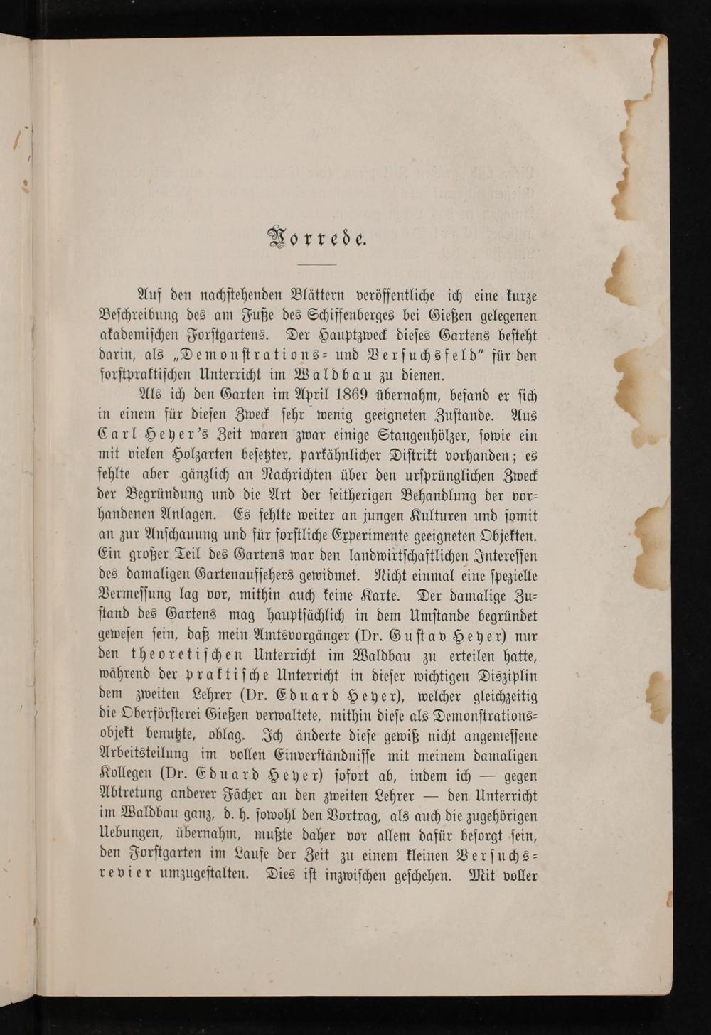 Als ich den Garten im April 1869 übernahm, befand er ſich in einem für dieſen Zweck ſehr wenig geeigneten Zuſtande. Aus Carl Heyer’s Zeit waren zwar einige Stangenhölzer, ſowie ein mit vielen Holzarten beſetzter, parkähnlicher Diſtrikt vorhanden; es fehlte aber gänzlich an Nachrichten über den urſprünglichen Zweck der Begründung und die Art der ſeitherigen Behandlung der vor⸗ handenen Anlagen. Es fehlte weiter an jungen Kulturen und ſomit an zur Anſchauung und für forſtliche Experimente geeigneten Objekten. Ein großer Teil des Gartens war den landwirtſchaftlichen Intereſſen des damaligen Gartenaufſehers gewidmet. Nicht einmal eine ſpezielle Vermeſſung lag vor, mithin auch keine Karte. Der damalige Zu⸗ ſtand des Gartens mag hauptſächlich in dem Umſtande begründet geweſen ſein, daß mein Amtsvorgänger(Dr. Guſtav Heyer) nur den theoretiſchen Unterricht im Waldbau zu erteilen hatte, während der praktiſche Unterricht in dieſer wichtigen Disziplin dem zweiten Lehrer(Dr. Eduard Heyer), welcher gleichzeitig die Oberförſterei Gießen verwaltete, mithin dieſe als Demonſtrations⸗ objekt benutzte, oblag. Ich änderte dieſe gewiß nicht angemeſſene Arbeitsteilung im vollen Einverſtändniſſe mit meinem damaligen Kollegen(Dr. Eduard Heyenr) ſofort ab, indem ich— gegen Abtretung anderer Fächer an den zweiten Lehrer— den Unterricht im Waldbau ganz, d. h. ſowohl den Vortrag, als auch die zugehörigen Uebungen, übernahm, mußte daher vor allem dafür beſorgt ſein, den Forſtgarten im Laufe der Zeit zu einem kleinen Verſuchs⸗ revier umzugeſtalten. Dies iſt inzwiſchen geſchehen. Mit voller