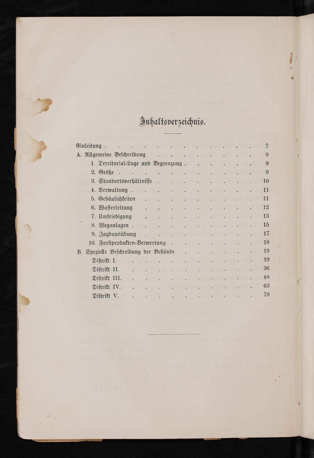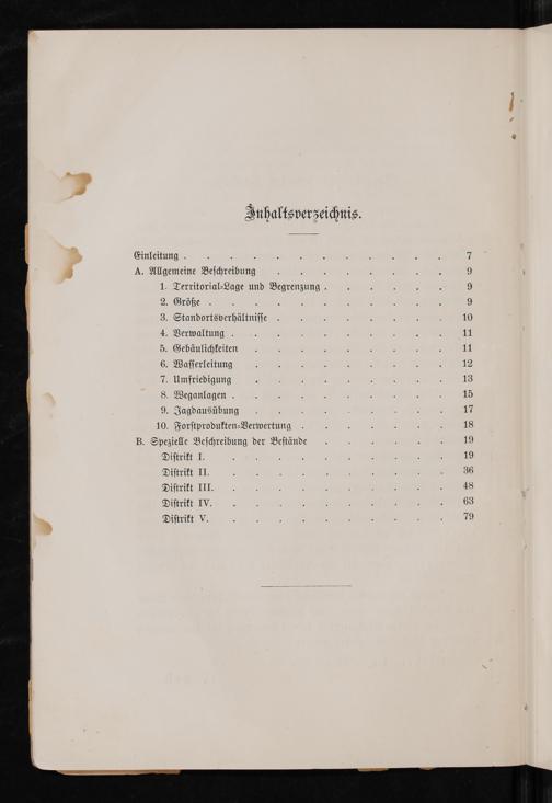 „ Einleitung. 3.. 4 A. Allgemeine Beſchreibung 3 Territorial⸗Lage und Begrenzung. . Größe .Standortsverhältniſſe . Verwaltung. . Gebäulichkeiten . Waſſerleitung . Umfriedigung Weganlagen. . Jagdausübung 10. Forſtprodukten⸗Verwertung B. Spezielle Beſchreibung der Beſtände Diſtrikt I. Diſtrikt II. Diſtrikt III. Diſtrikt IV. Diſtrikt V.