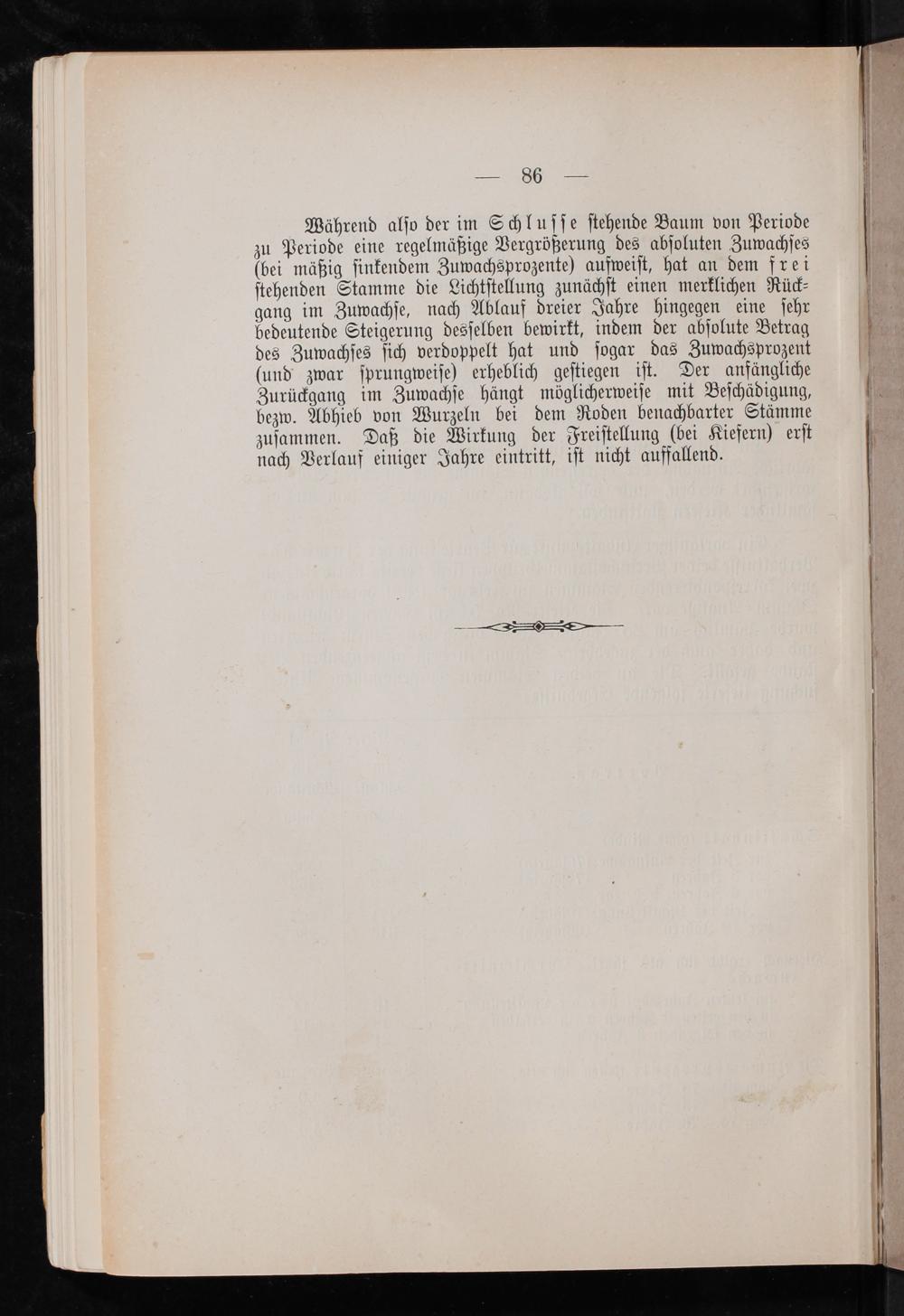 Während alſo der im Schluſſe ſtehende Baum von Periode zu Periode eine regelmäßige Vergrößerung des abſoluten Zuwachſes (bei mäßig ſinkendem Zuwachsprozente) aufweiſt, hat an dem frei ſtehenden Stamme die Lichtſtellung zunächſt einen merklichen Rück⸗ gang im Zuwachſe, nach Ablauf dreier Jahre hingegen eine ſehr
