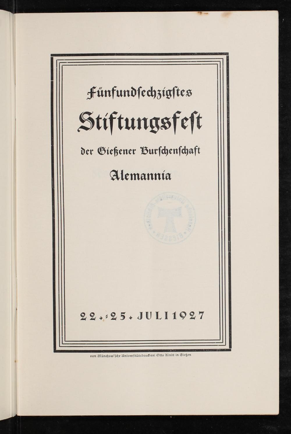 Fünfzundsechzigstes Stiftungsfest der Gießener Burschenschaft Alemannia, 22.-25. Juli 1927 : [Kommerslieder] / [Gießener Burschenschaft Alemannia]